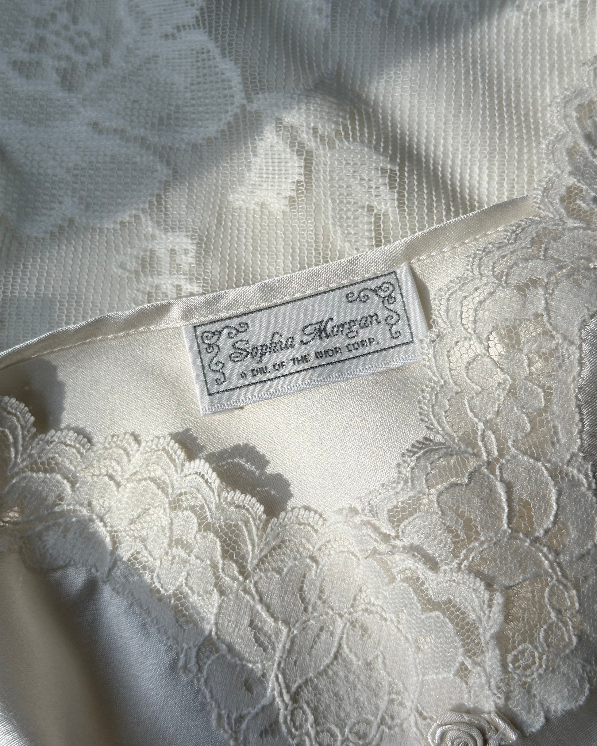 - Vintage pearl white slip dress featuring beautiful mermaid tail skirt with satin bodice and laced bustier
