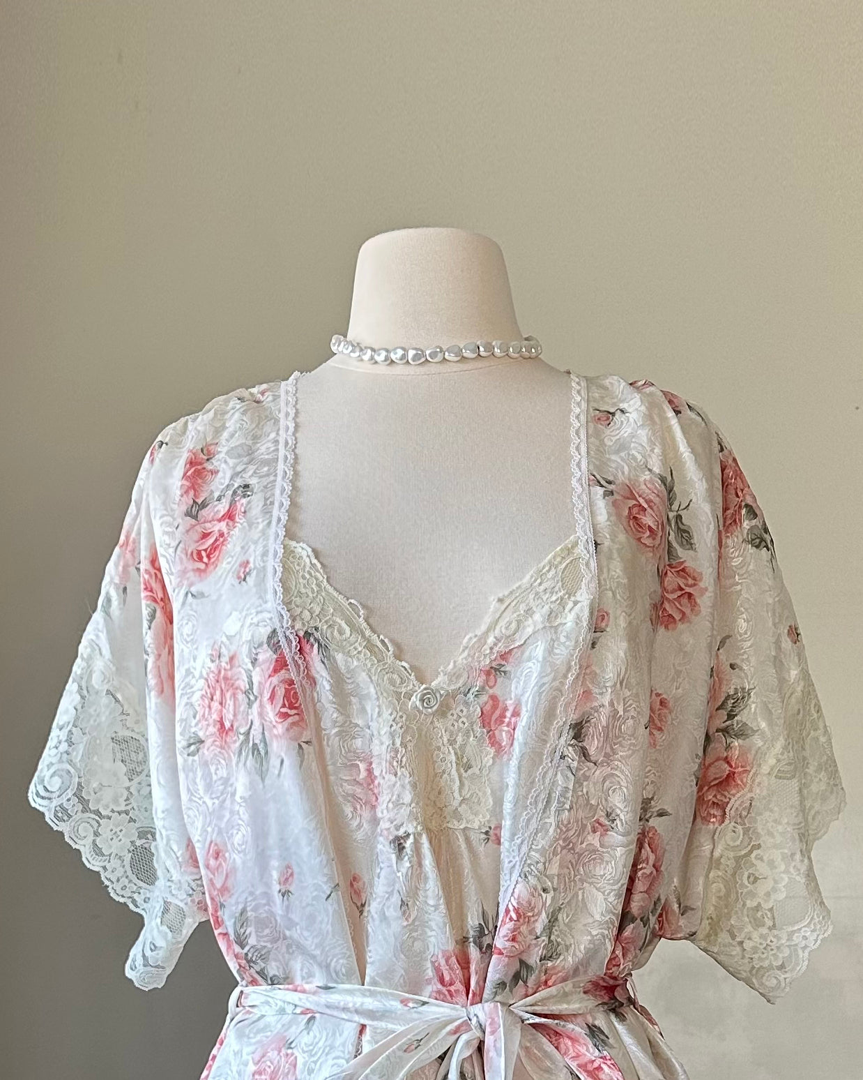 - Stunning vintage rosette set include rose embossed slip dress featuring sheer lace bustier lining and a matching robe with laced sleeves