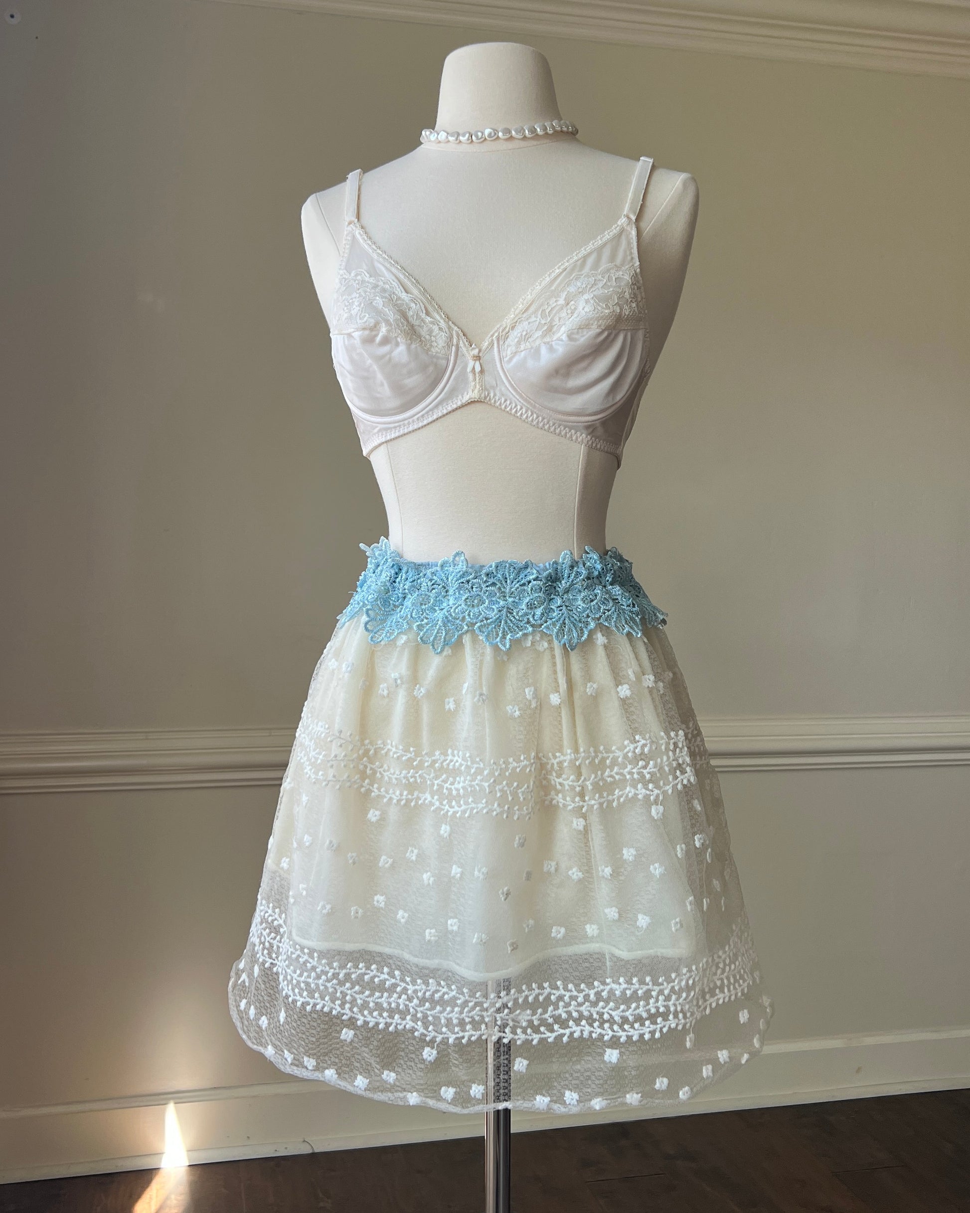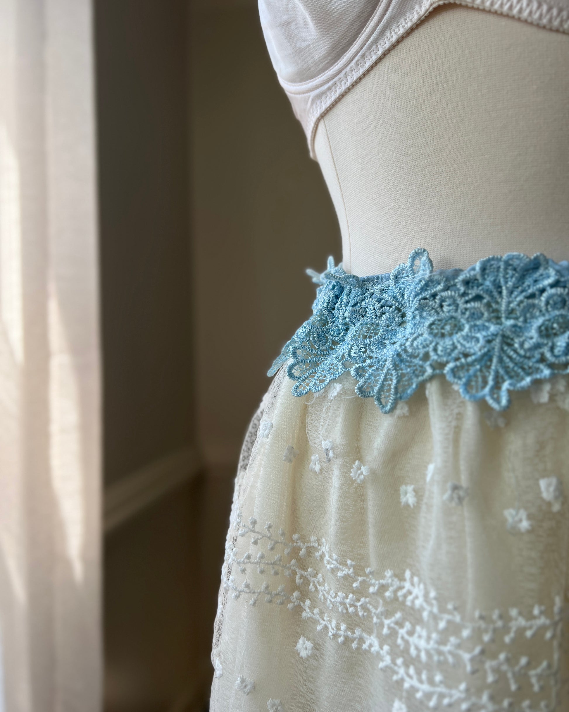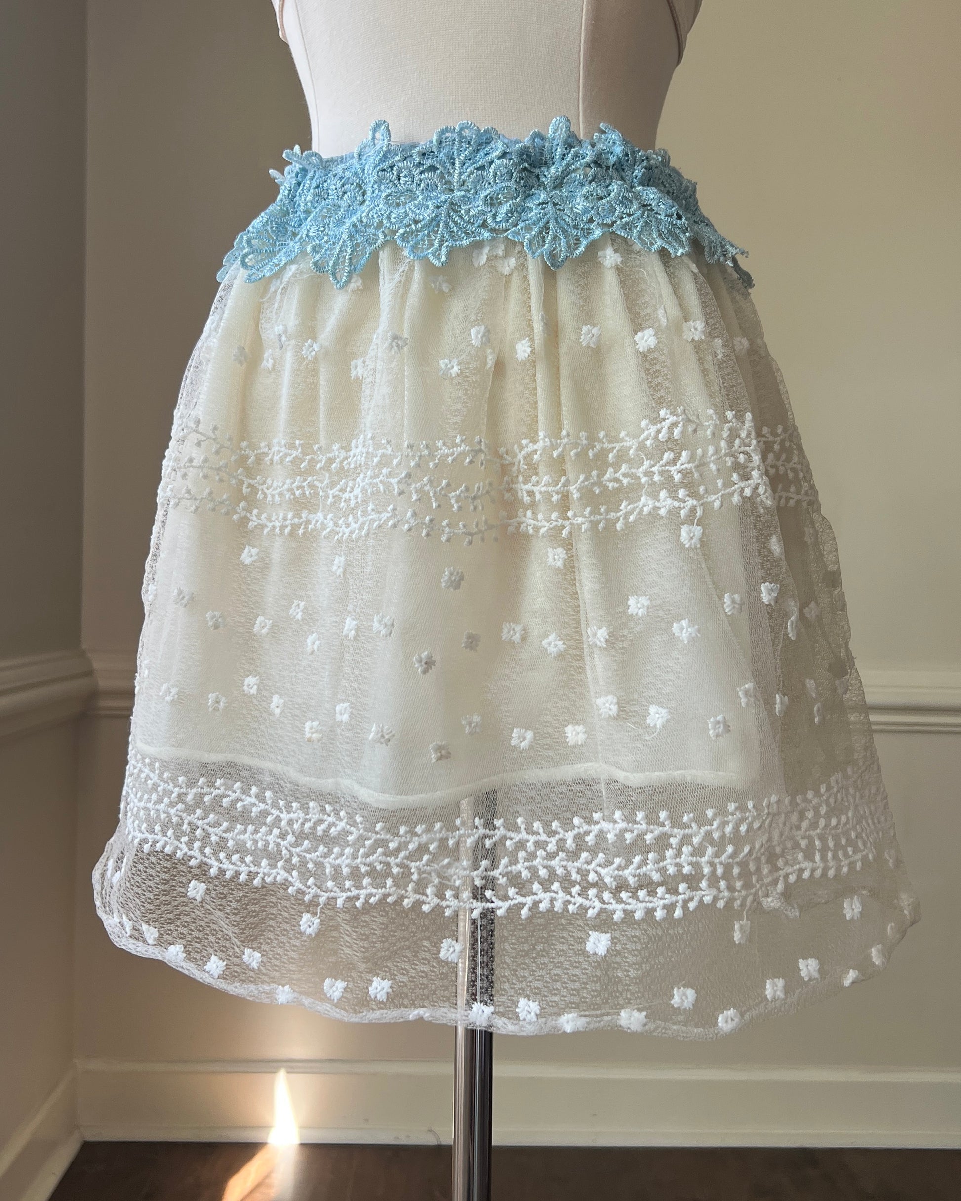 Adorable Sheer Fairy Skirt featuring Sheer Outer Layer with Leafy Embroidery and a Blue Floral Waist