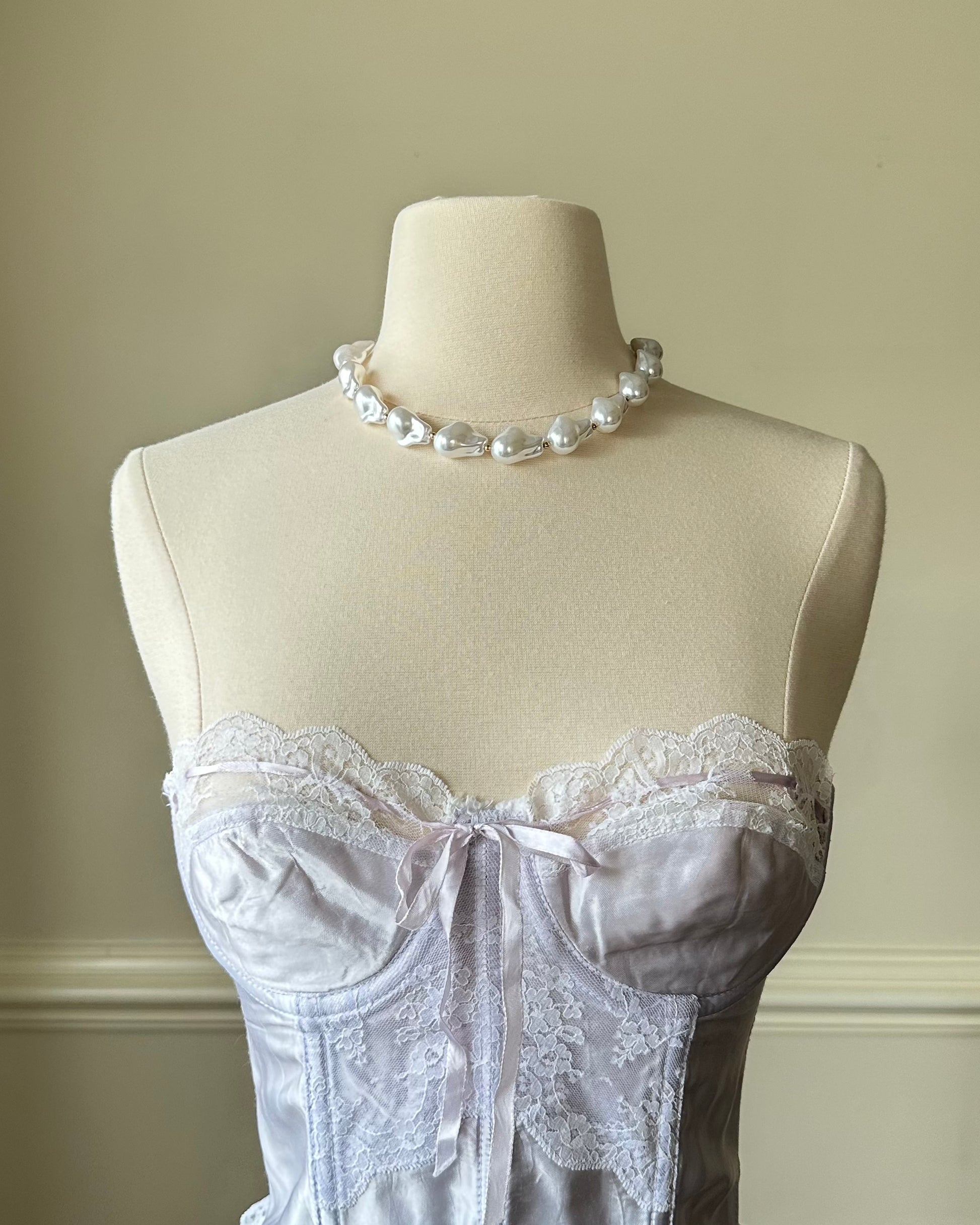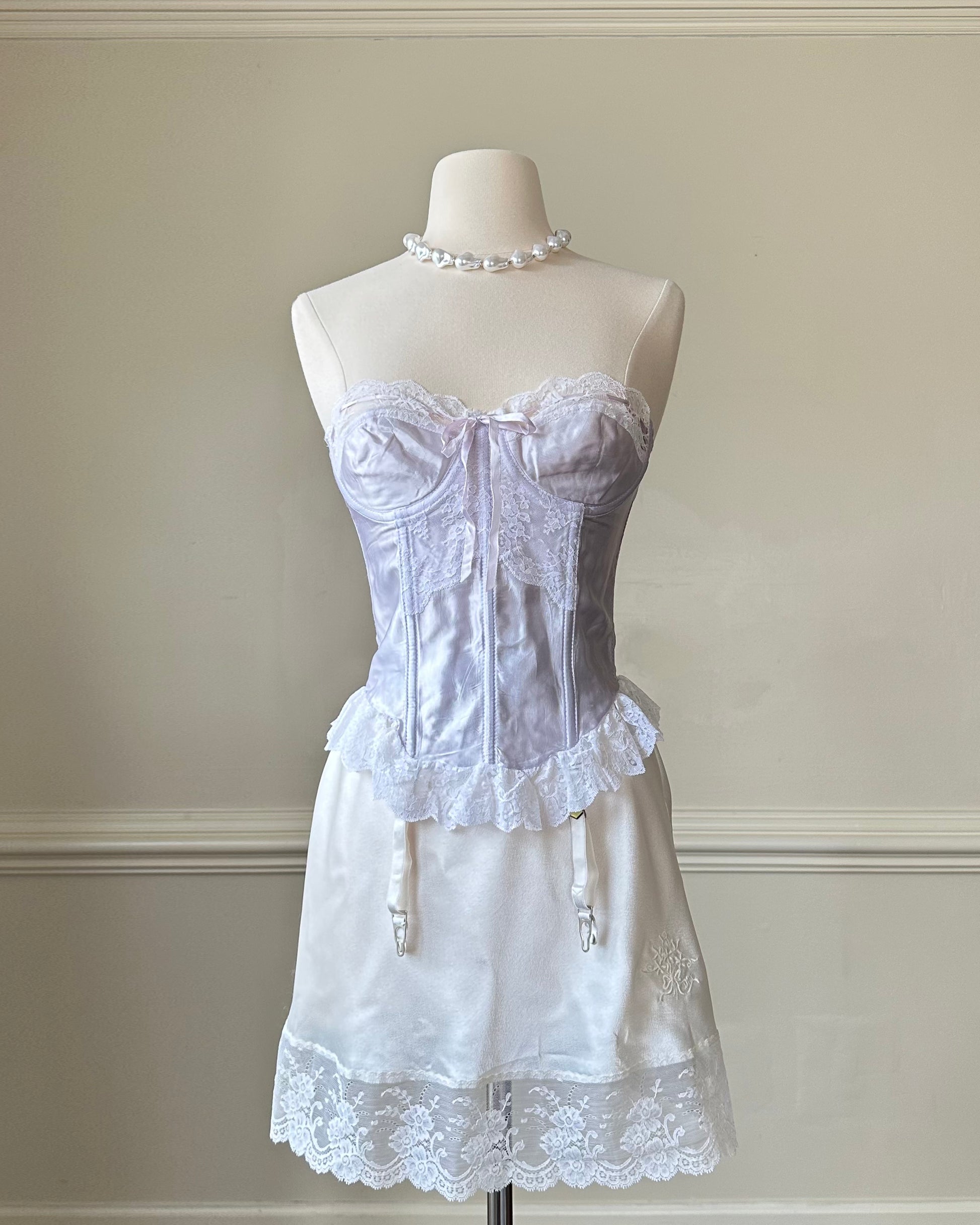 - Satin Frederick's of Hollywood strapless corset in light iris purple featuring laced details with ruffled lace trimmings and framed bust