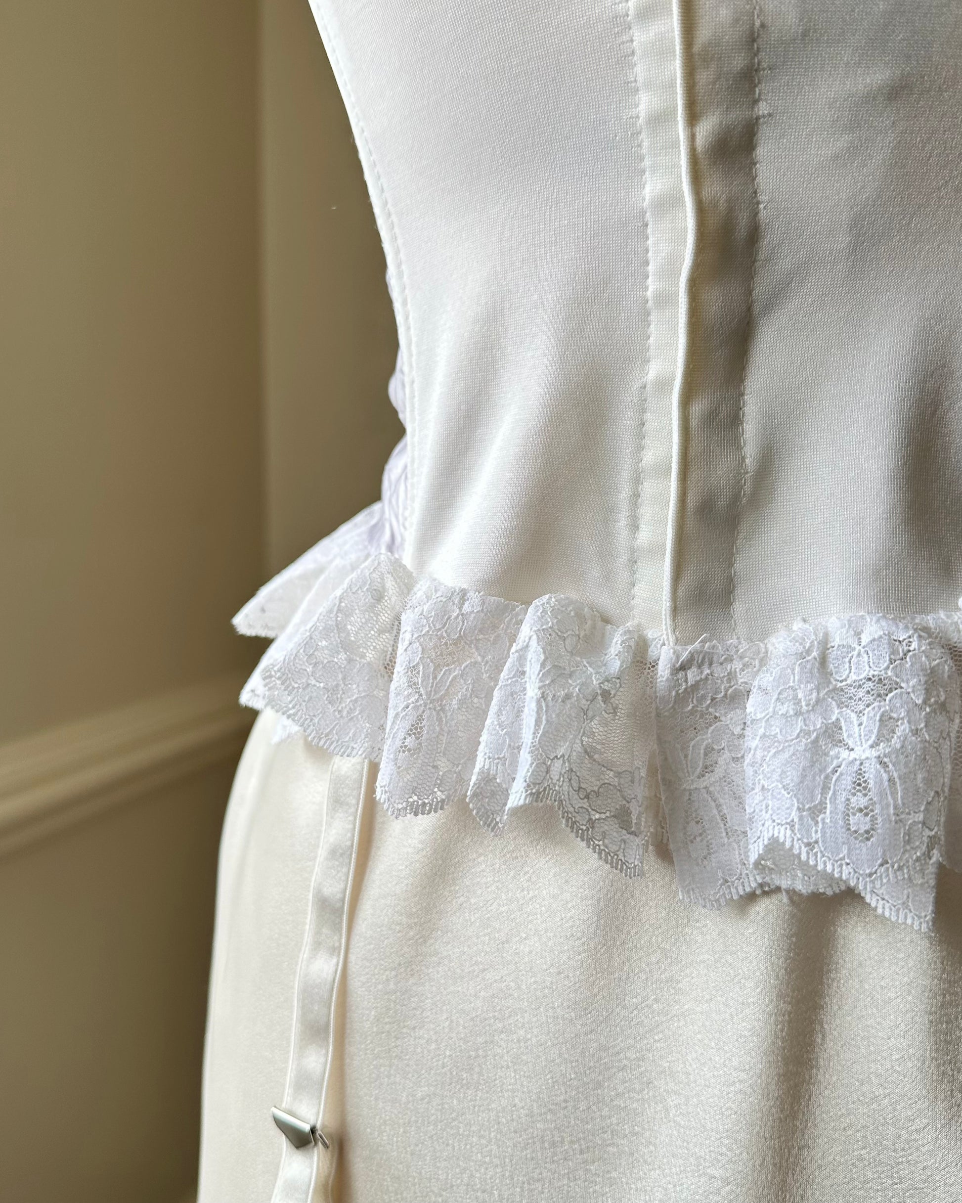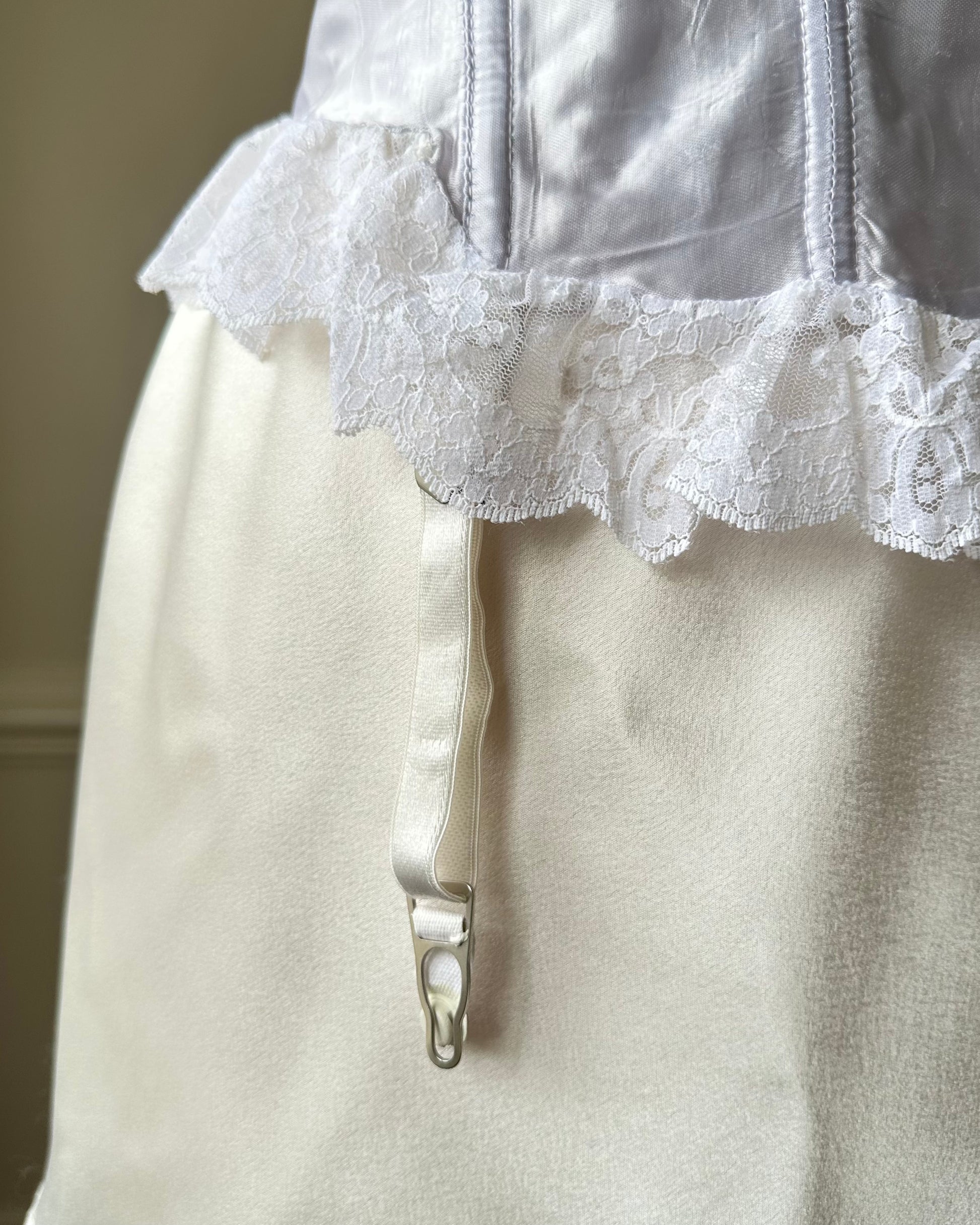 - hook-and-eye closure; garter straps included
