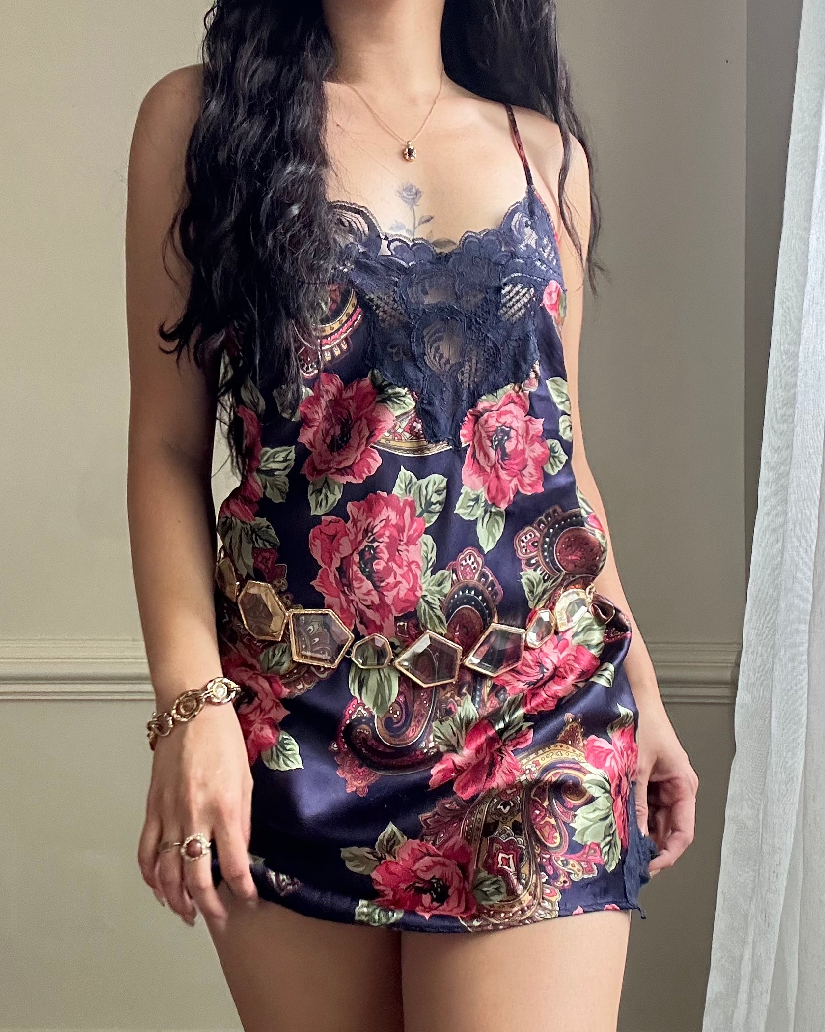 Dark navy satin dress featuring overlapping paisley and flower pattern