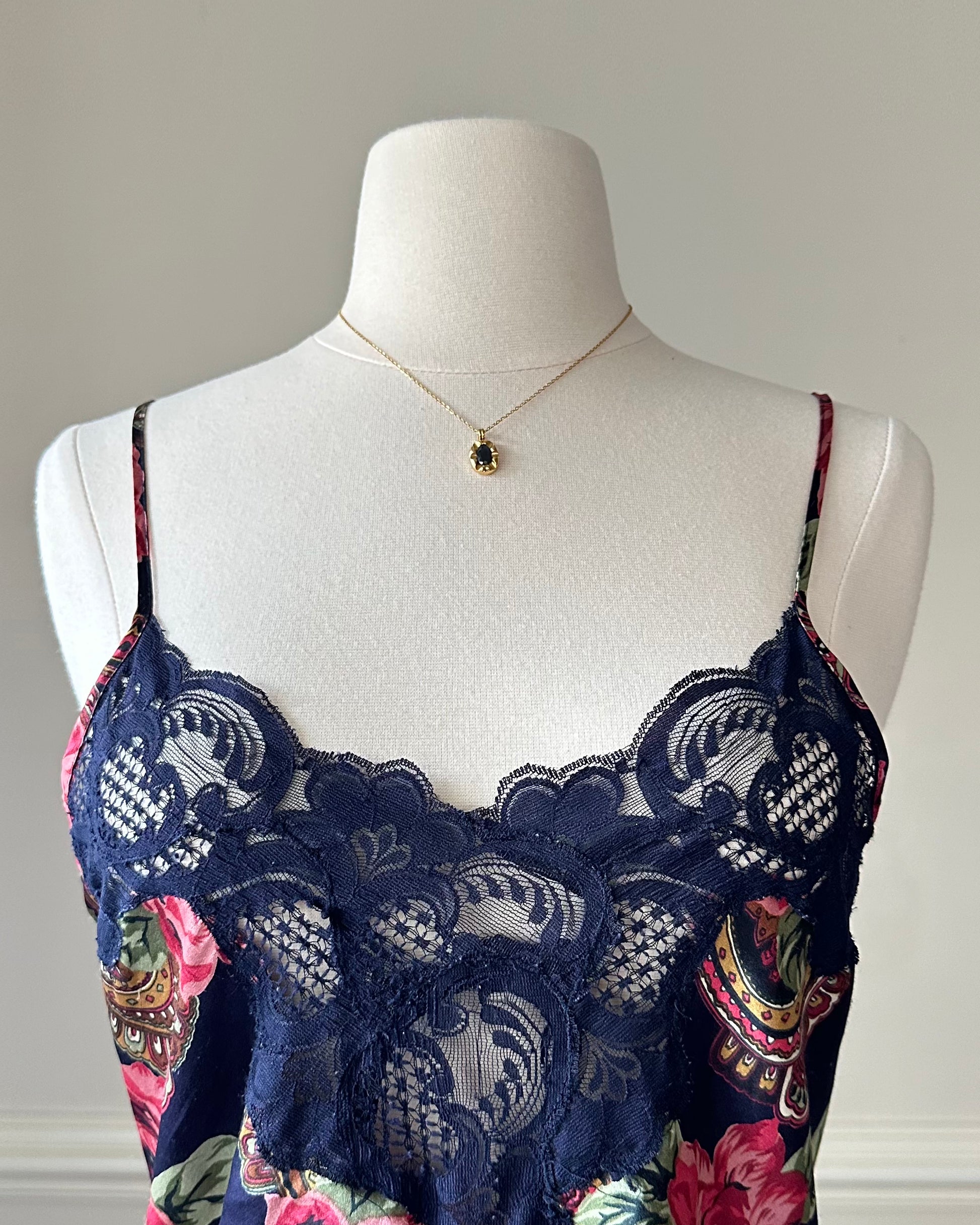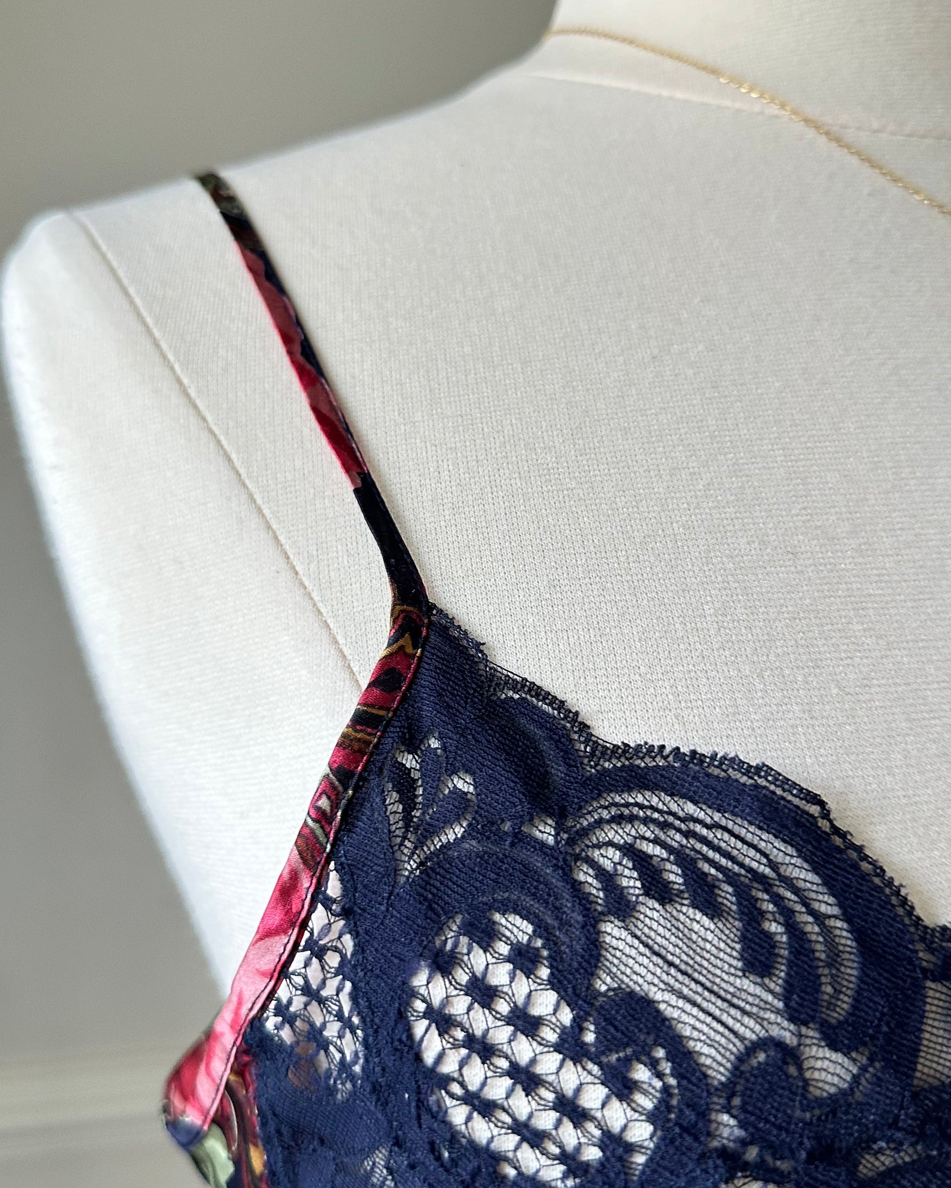 - Dark navy satin dress featuring overlapping paisley and flower pattern with lace embroidery bustier and hem details