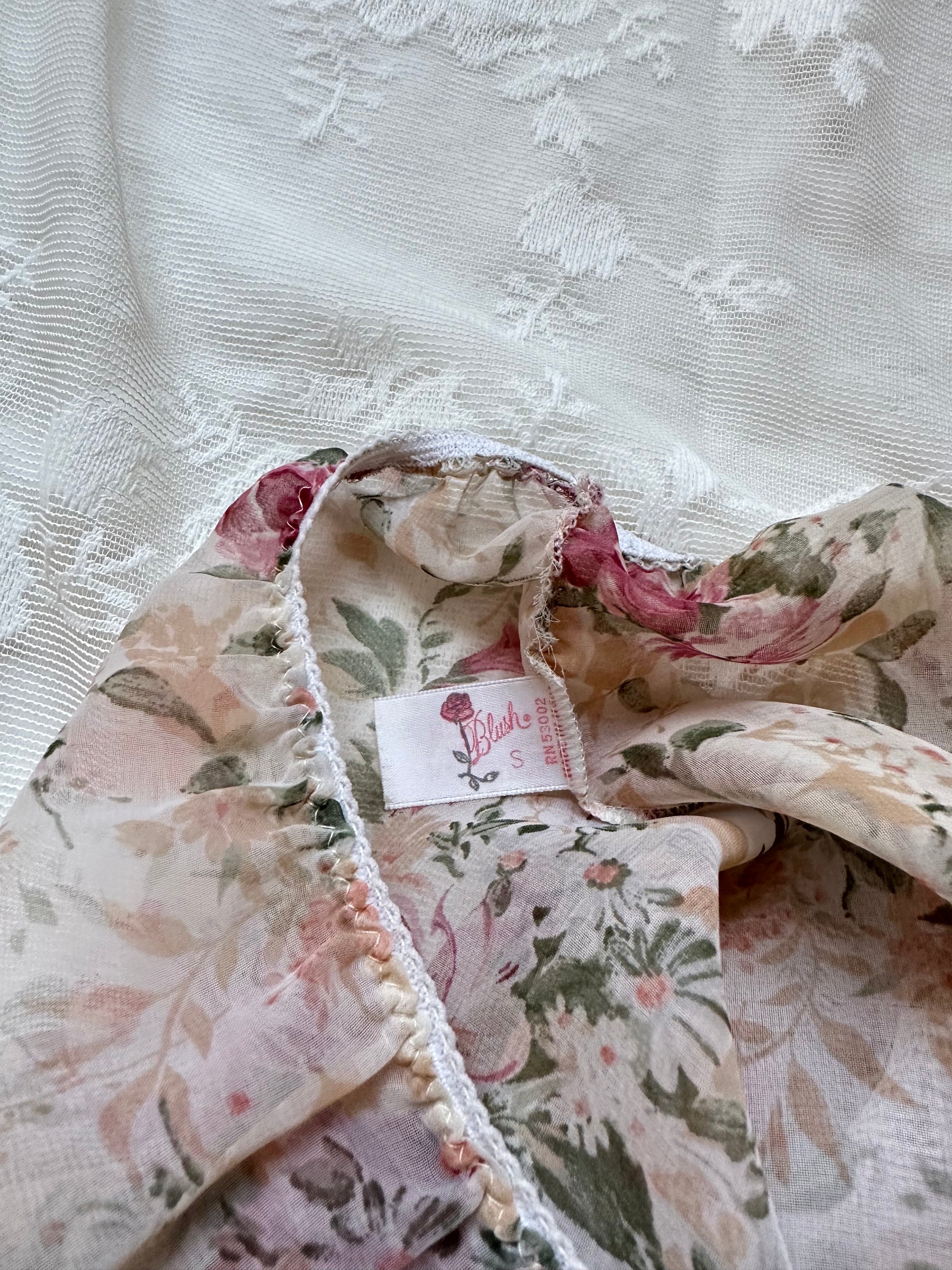 ༄ Dreamy sheer vintage floral dress featuring rose garden prints with soft lace skirt lining