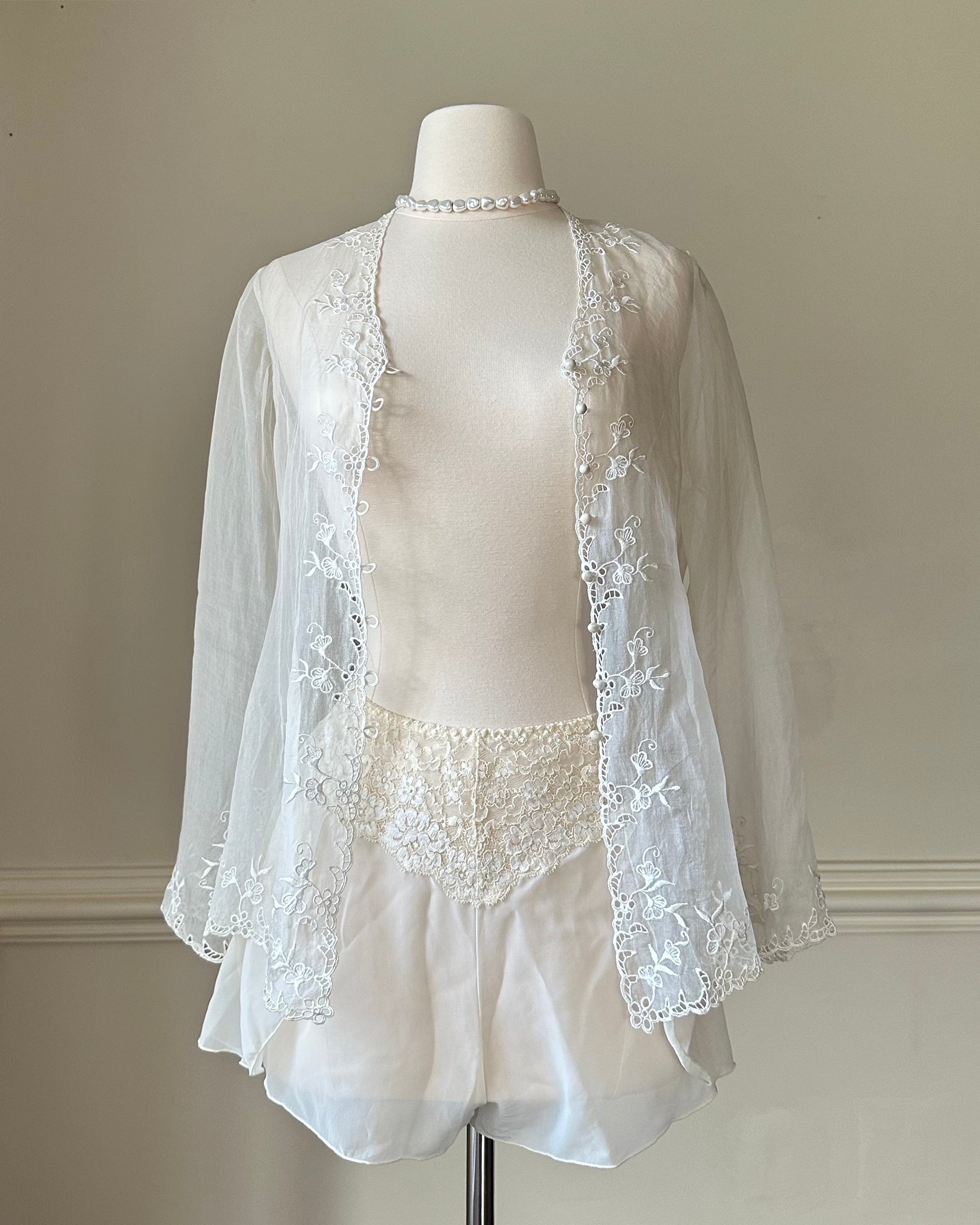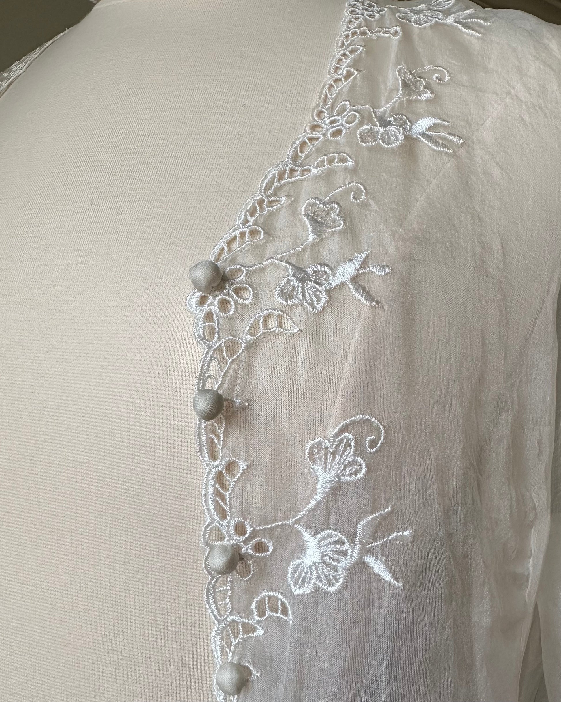 Elegant sheer long sleeves blouse featuring floral embroidery with fabricated buttons