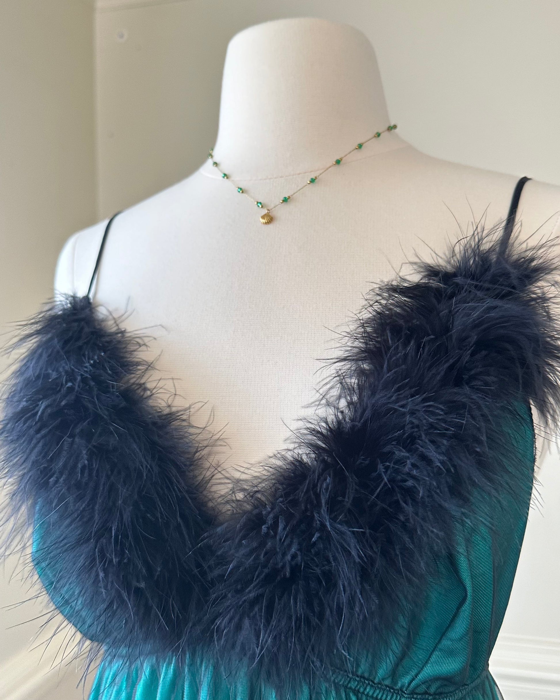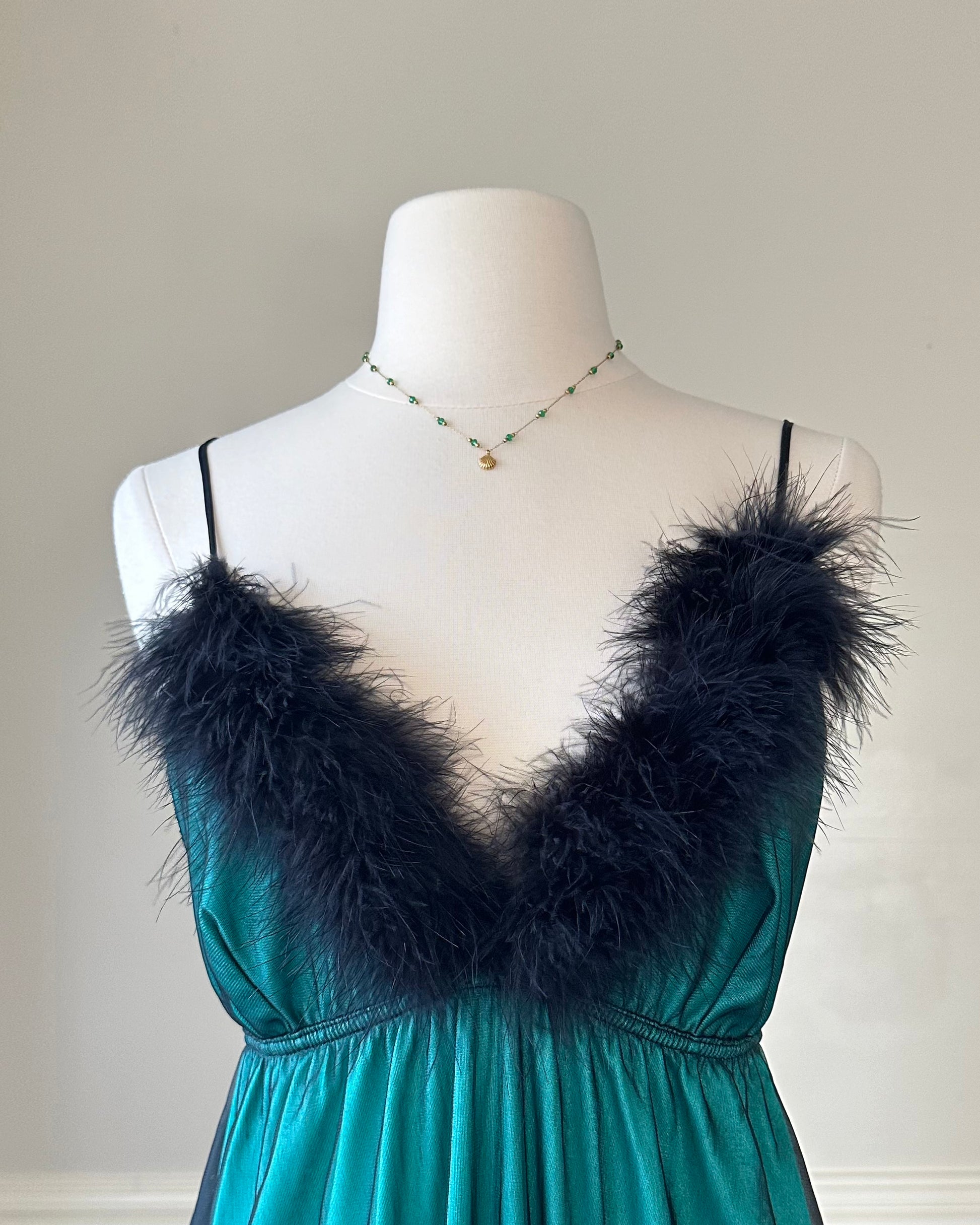 - Emerald green maxi dress featuring sheer black mesh layout with flocked collar detail - thin straps; cinched waist