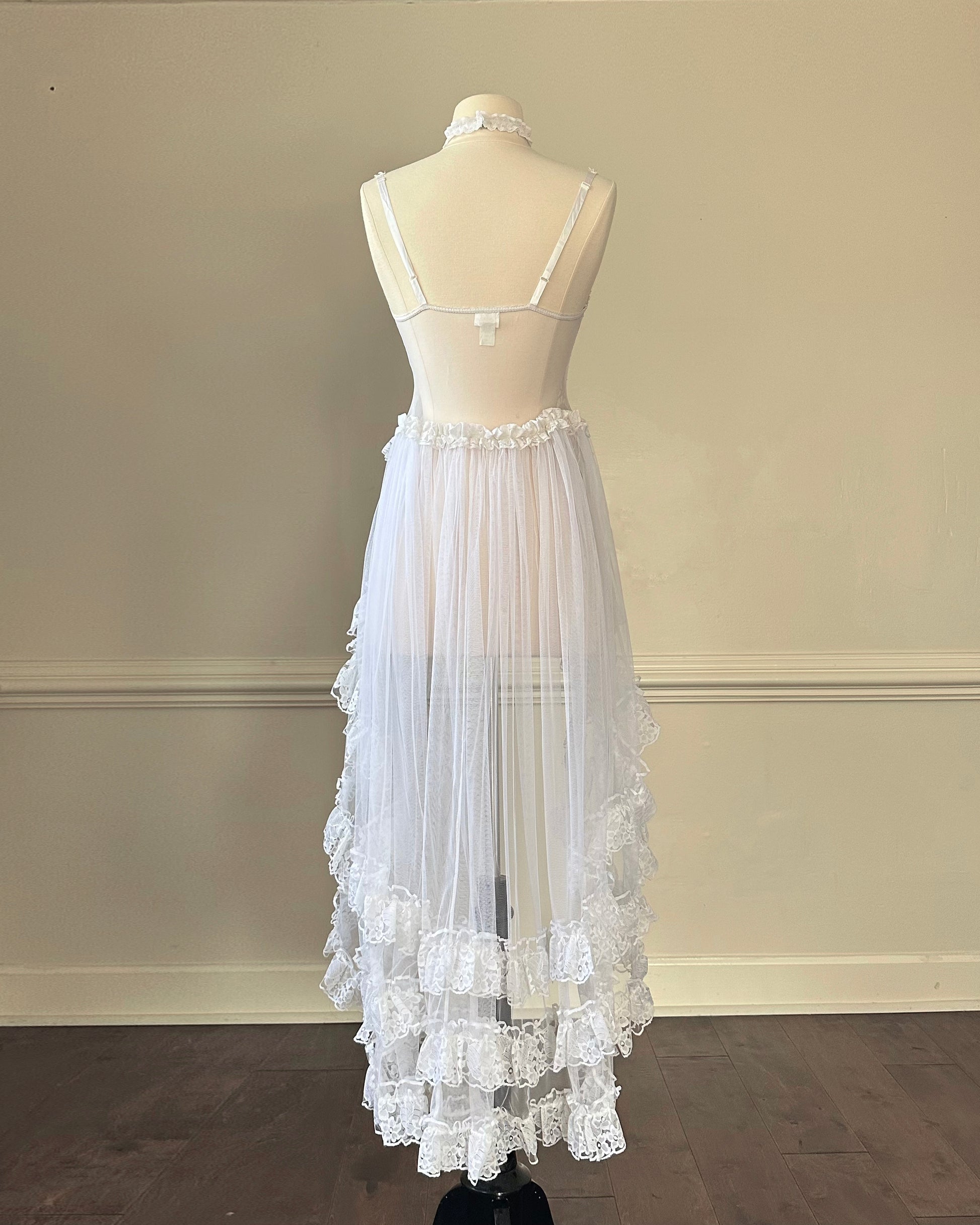 Frederick’s stunning bridal-inspired sheer slip dress featuring crimson red velvet bustier patch detail