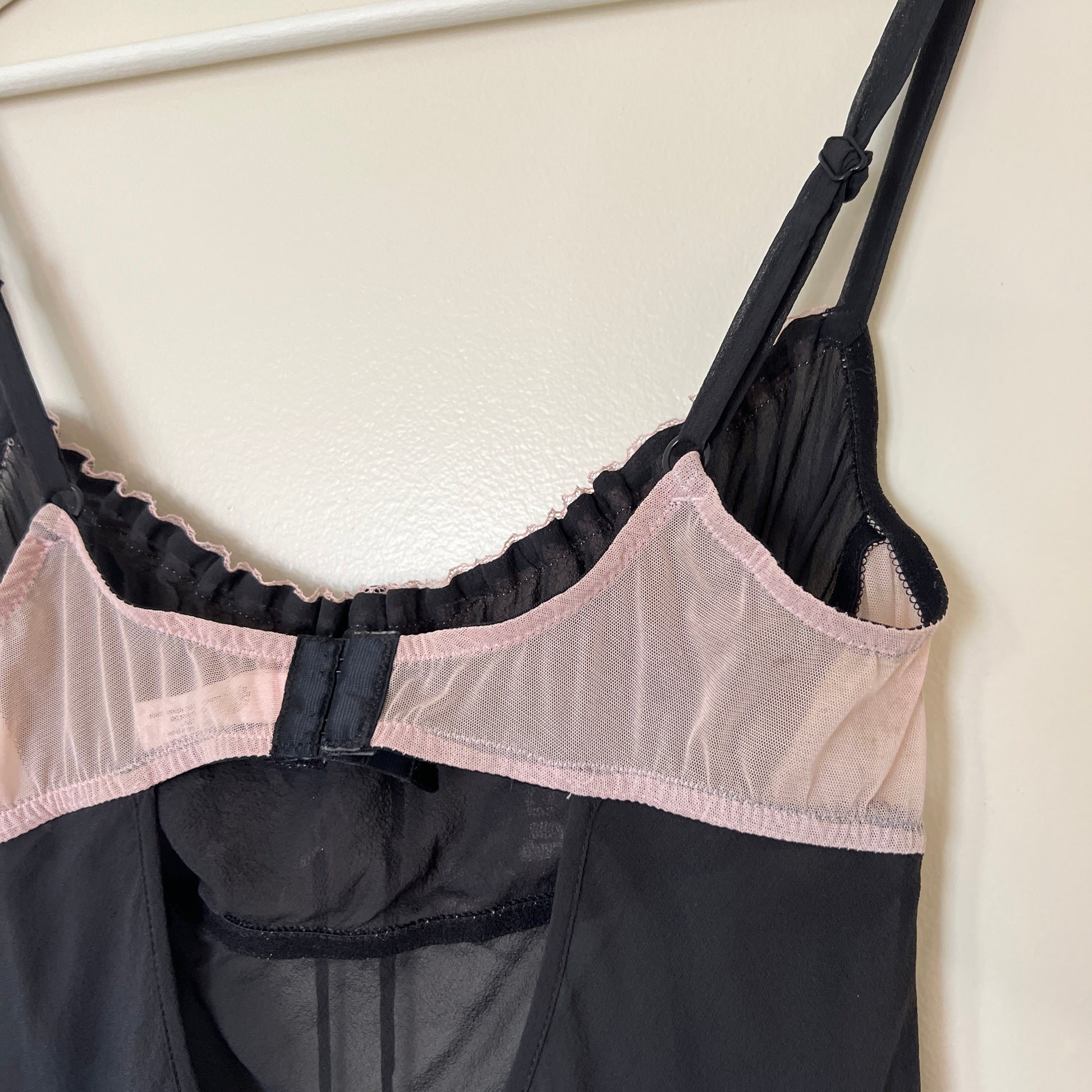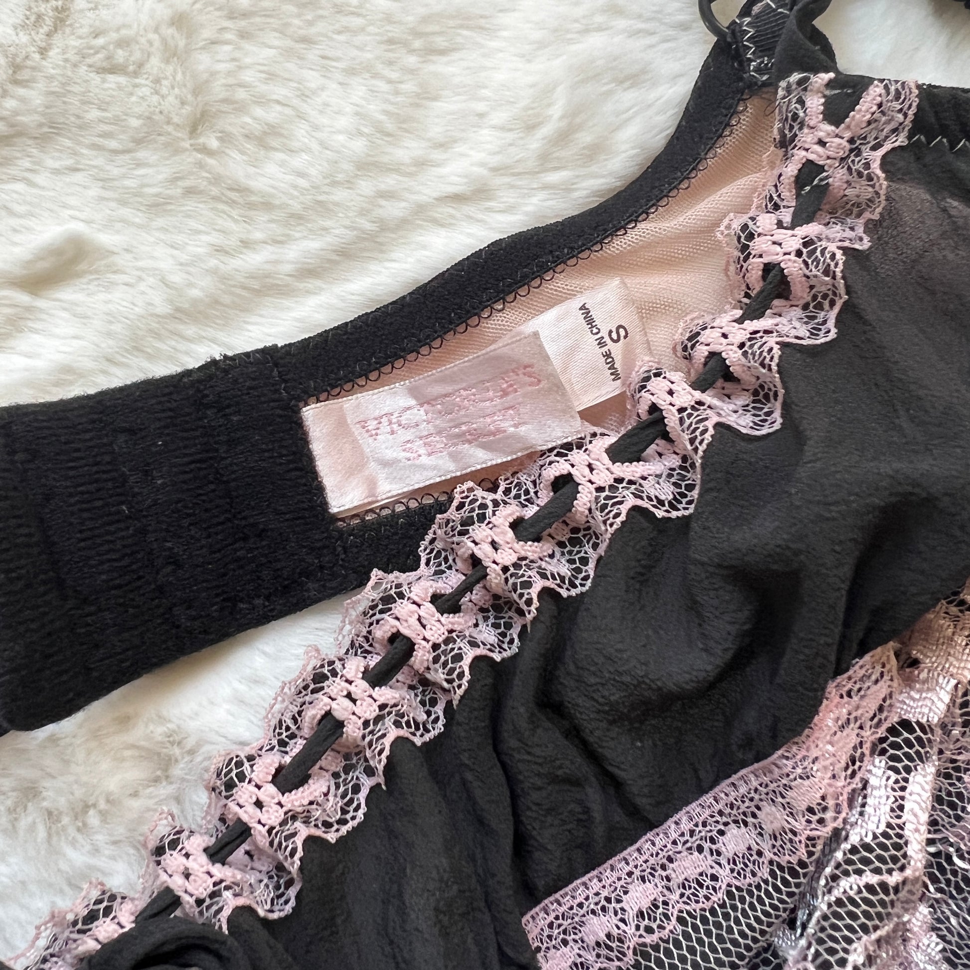 ༄ Paris Hilton Victoria’s Secret milkmaid doll slip dress featuring sheer pink rosette lace embroidery at bustier