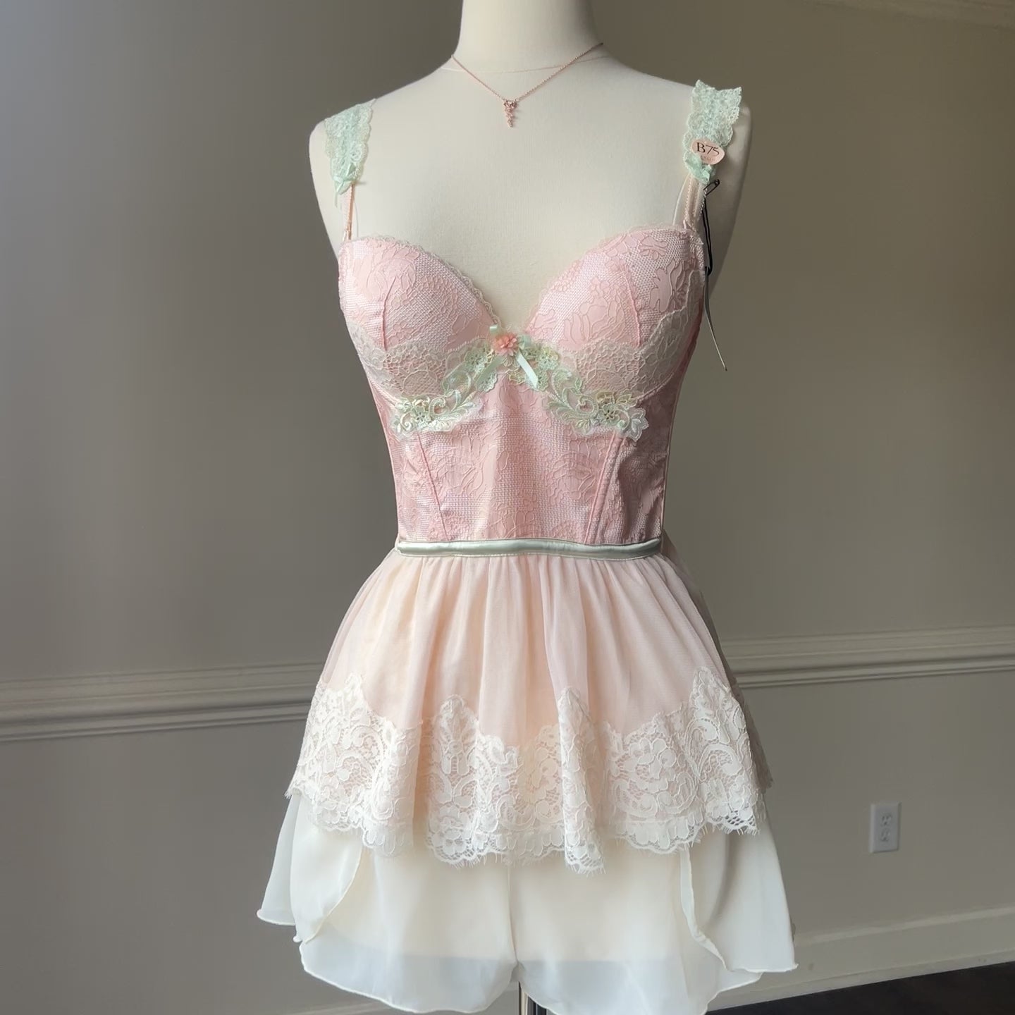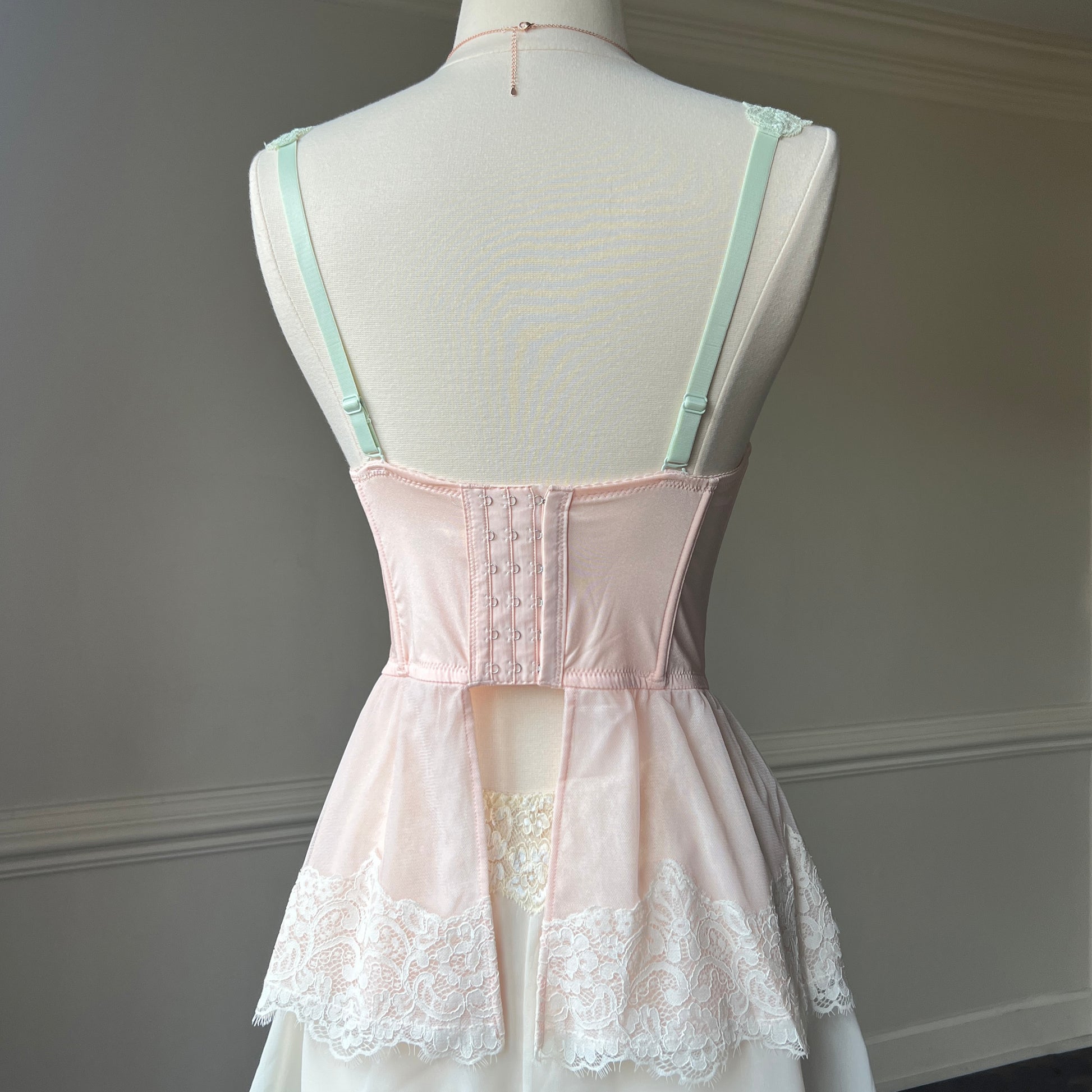 ༄ laced straps; adorned with roses; hook-and-eye back closure