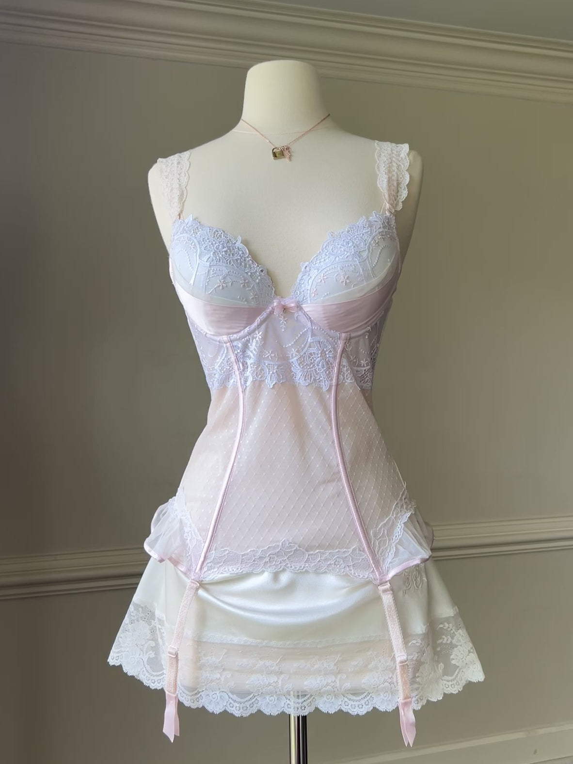 ༄ Regal babydoll special corset featuring soft laced bustier with sheer polkas bodice