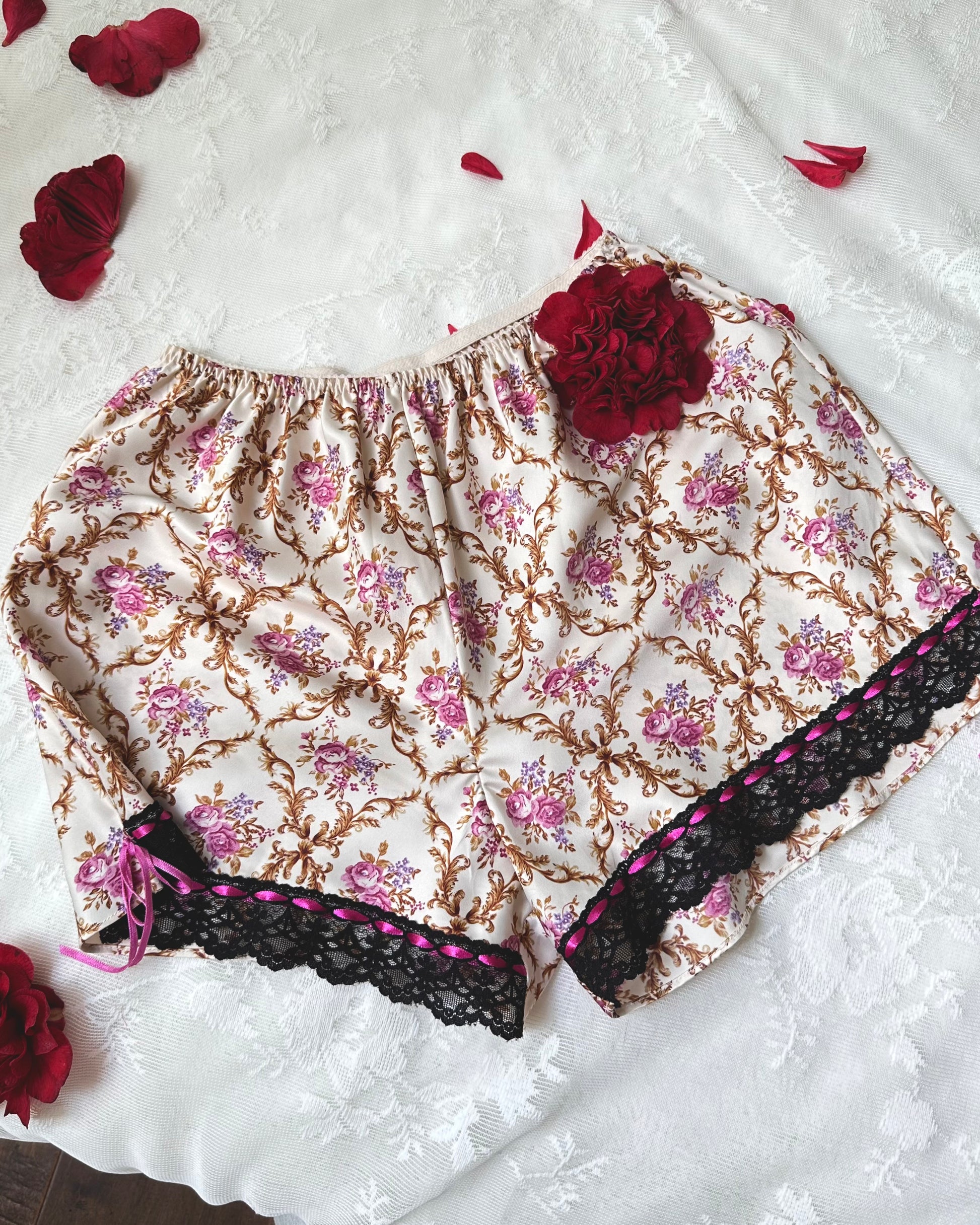 - Satin short featuring brocade pattern with lace trimmings and satin stitching