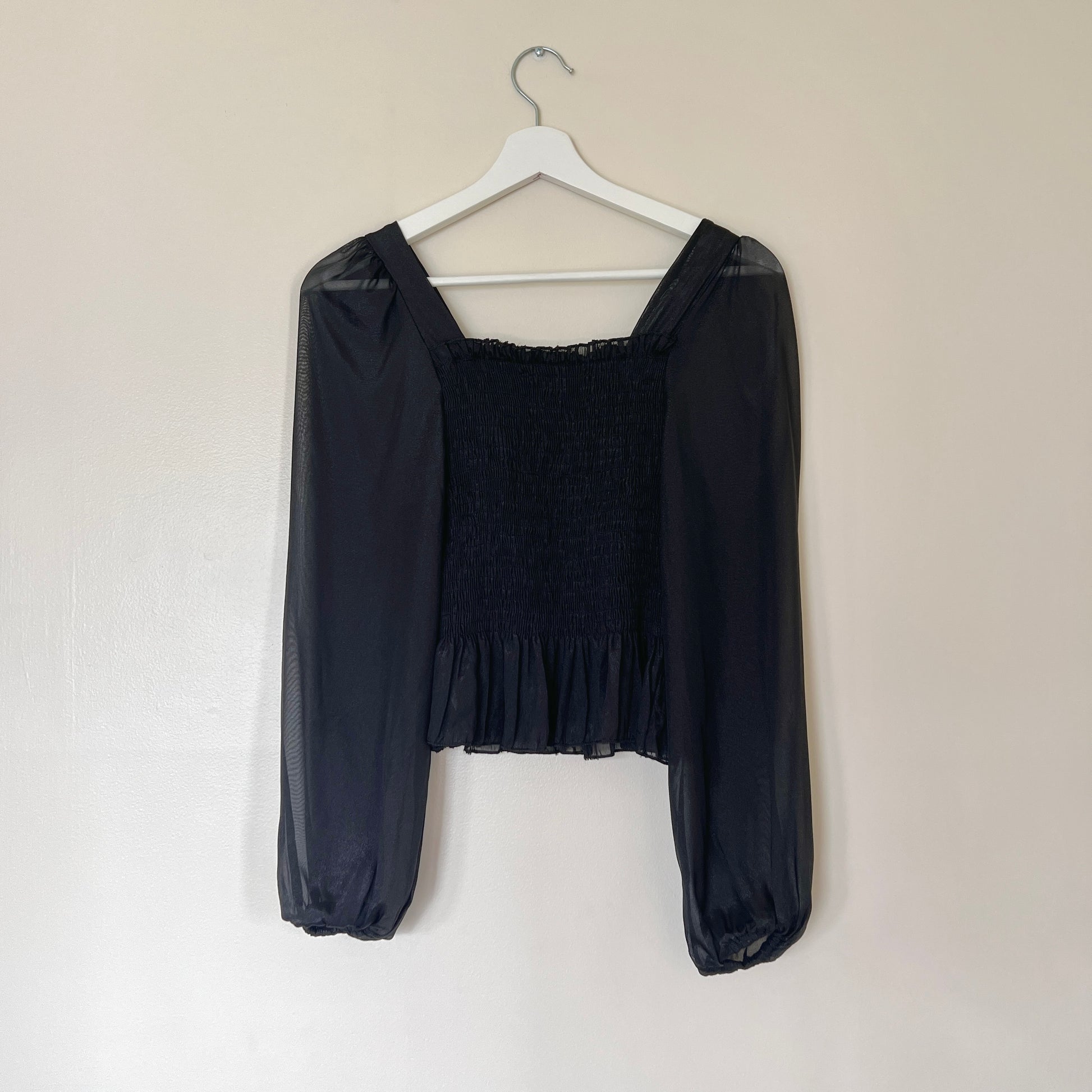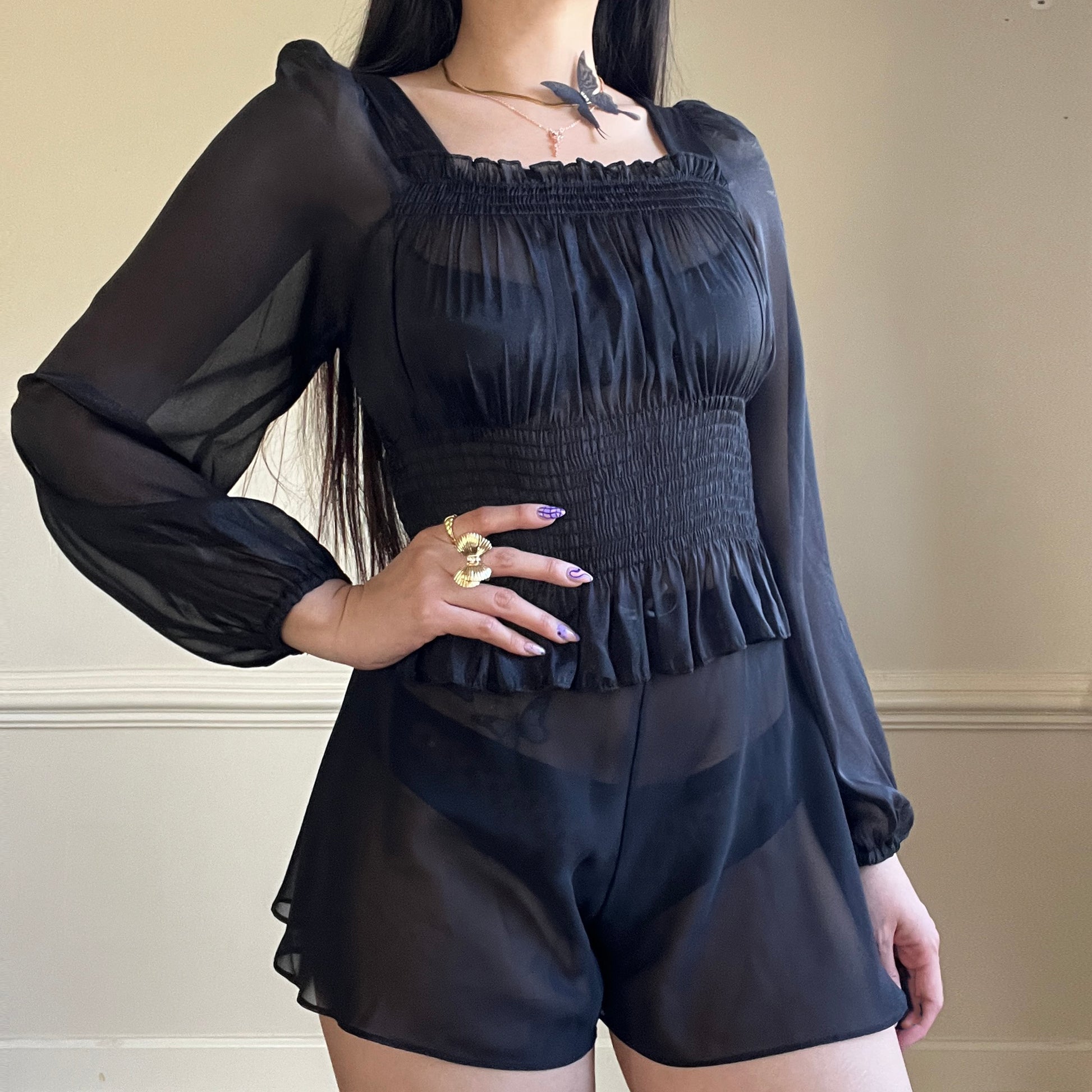 ༄ sheer black organza cropped top featuring pleated fabric with ribbed waistline