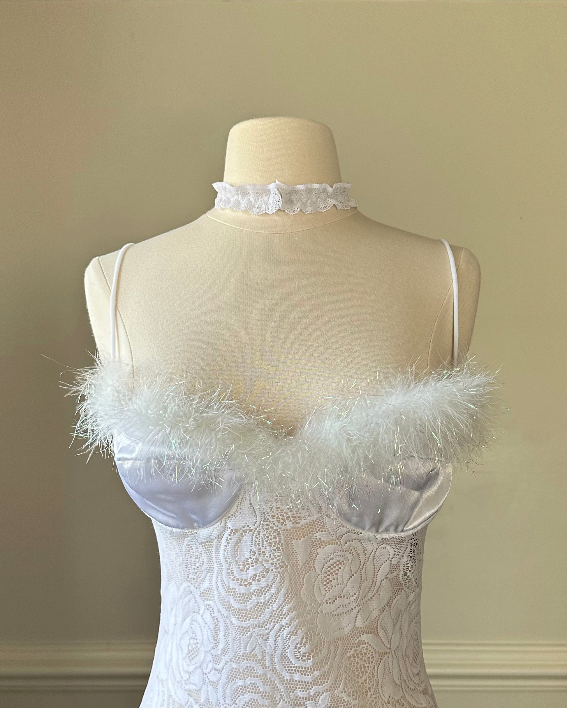 - Toska’s sultry swan-like slip dress featuring flocked bustier with rose embroidery bodice and sheer fairy skirt