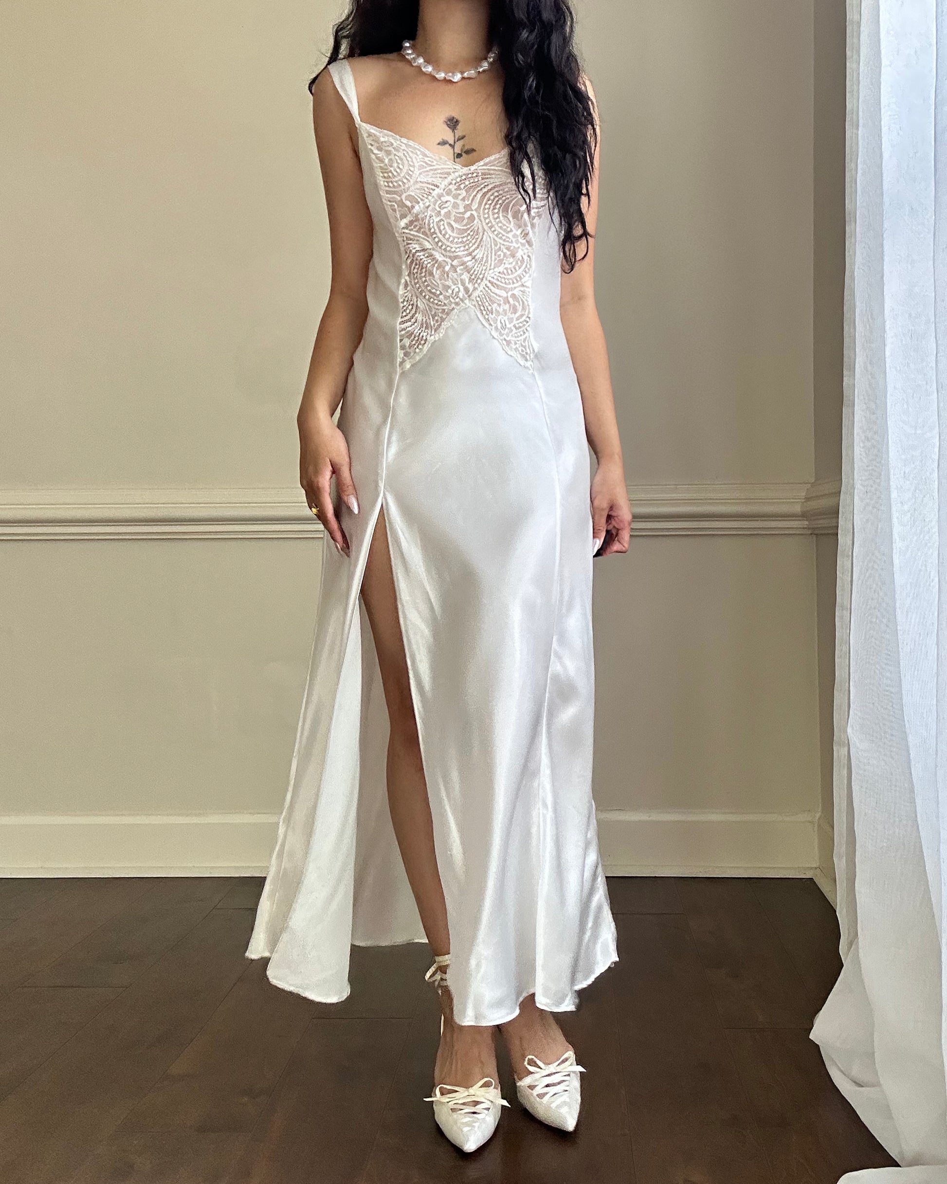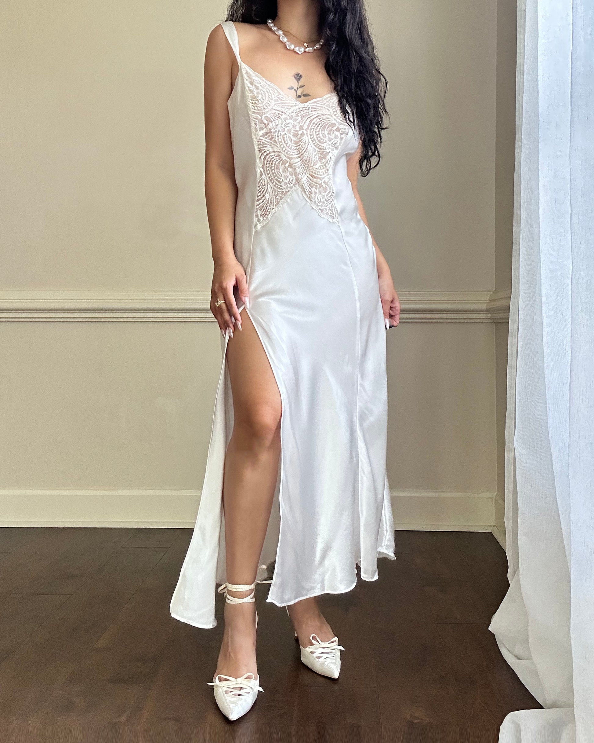 - Victoria’s Secret ethereal satin maxi slip dress in pearl white featuring intricate lace embroidery bodice with knee split hem