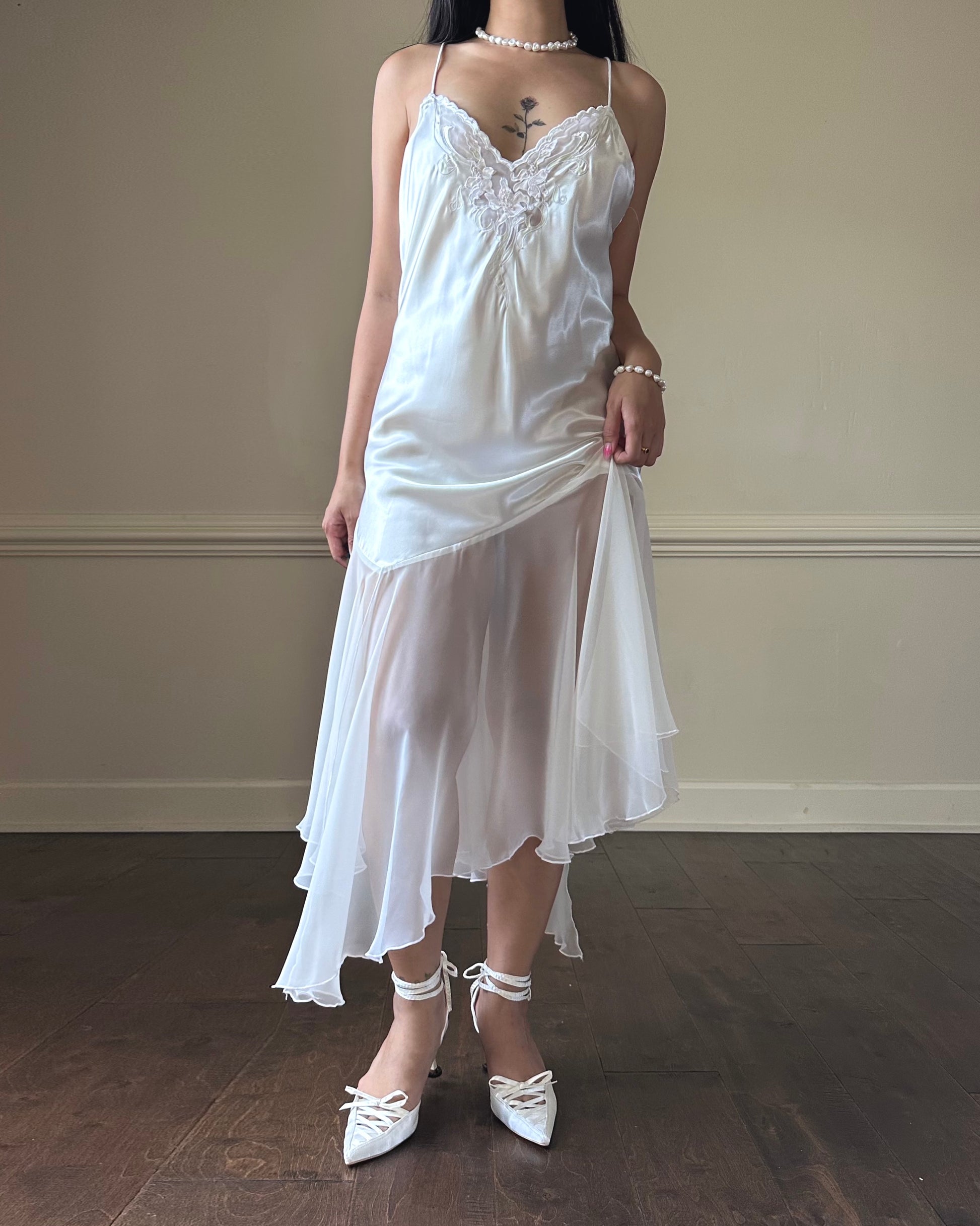 ༄ Victoria’s Secret mermaid satin maxi dress featuring floral embroidery bust detail with asymmetrical flowing skirt