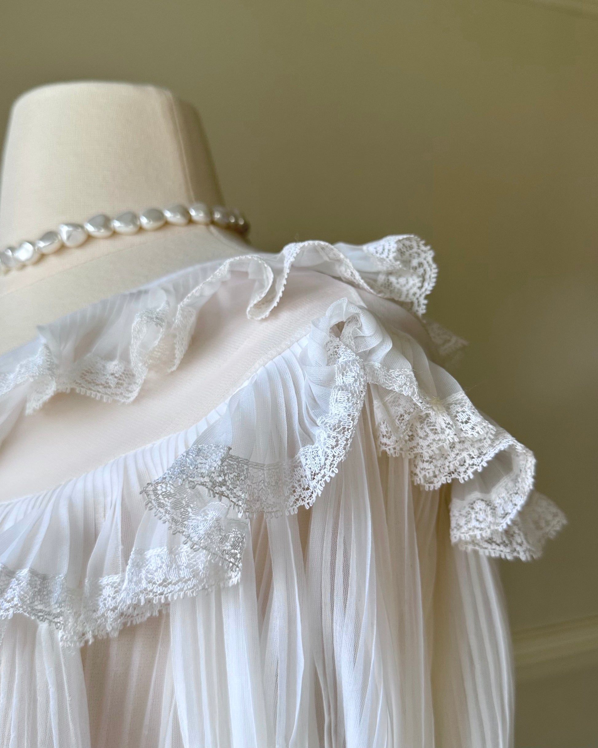 Victorian inspired sheer white robes featuring double layered ruffles collar with pleated chiffon material