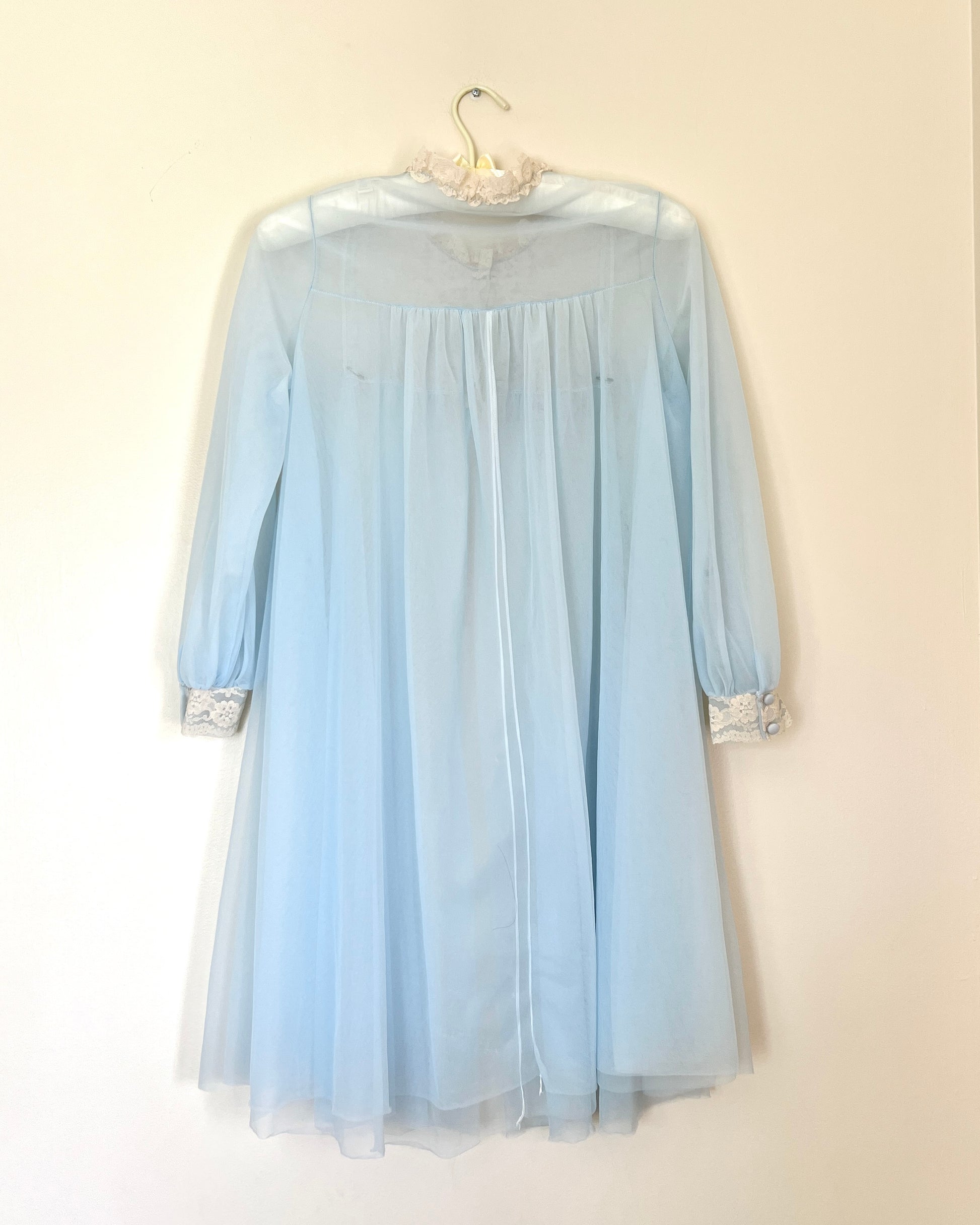 Vintage 80’s Baby Blue Chiffon Robe featuring Sheer Cream Floral Embroidery