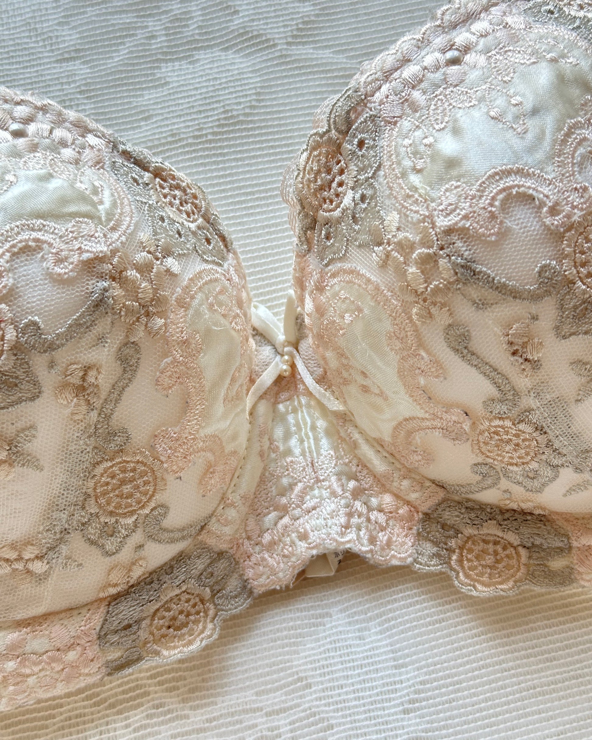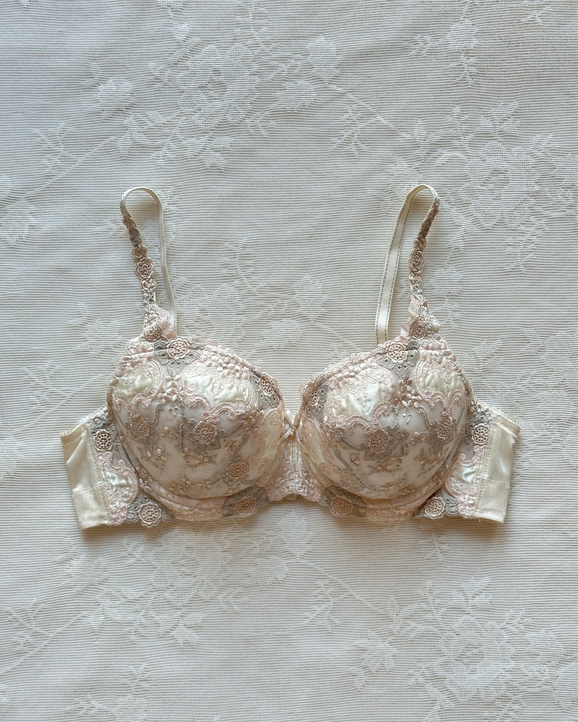 - vintage cream Japanese brassiere featuring neutral intricate embroidered pattern with lace trimmings