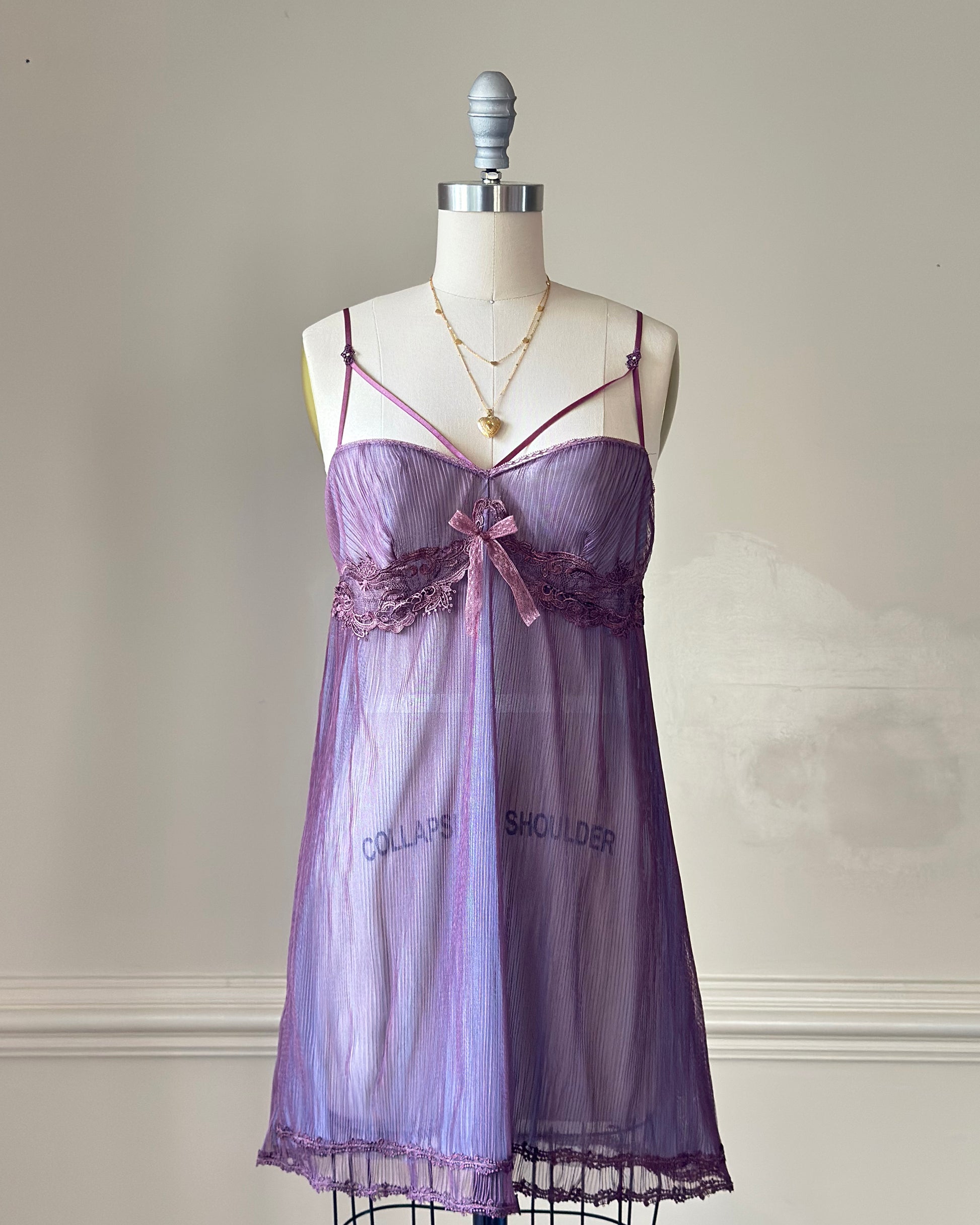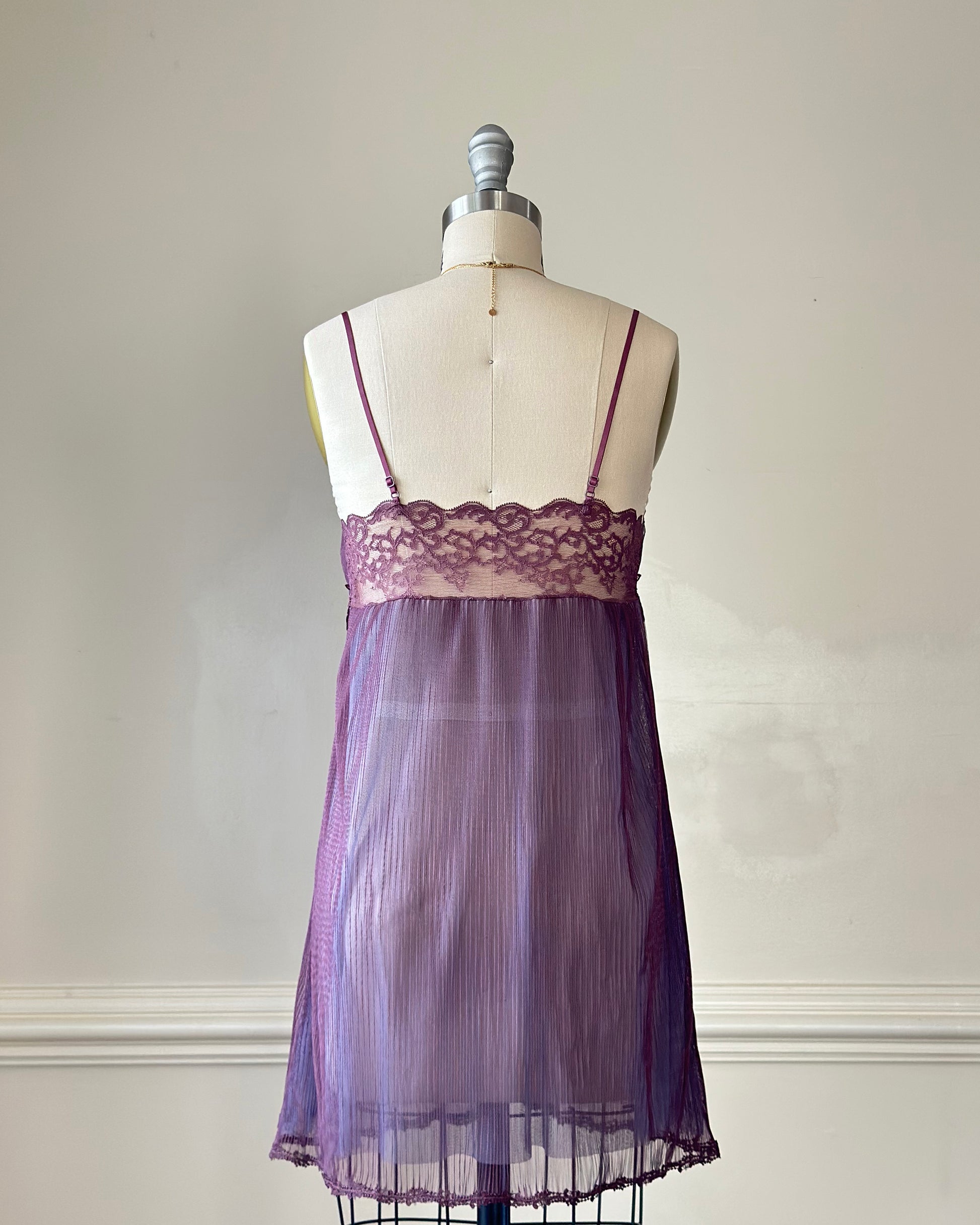 – Made of sheer micro-pleated mesh in a romantic dusty plum hue with blue undertones