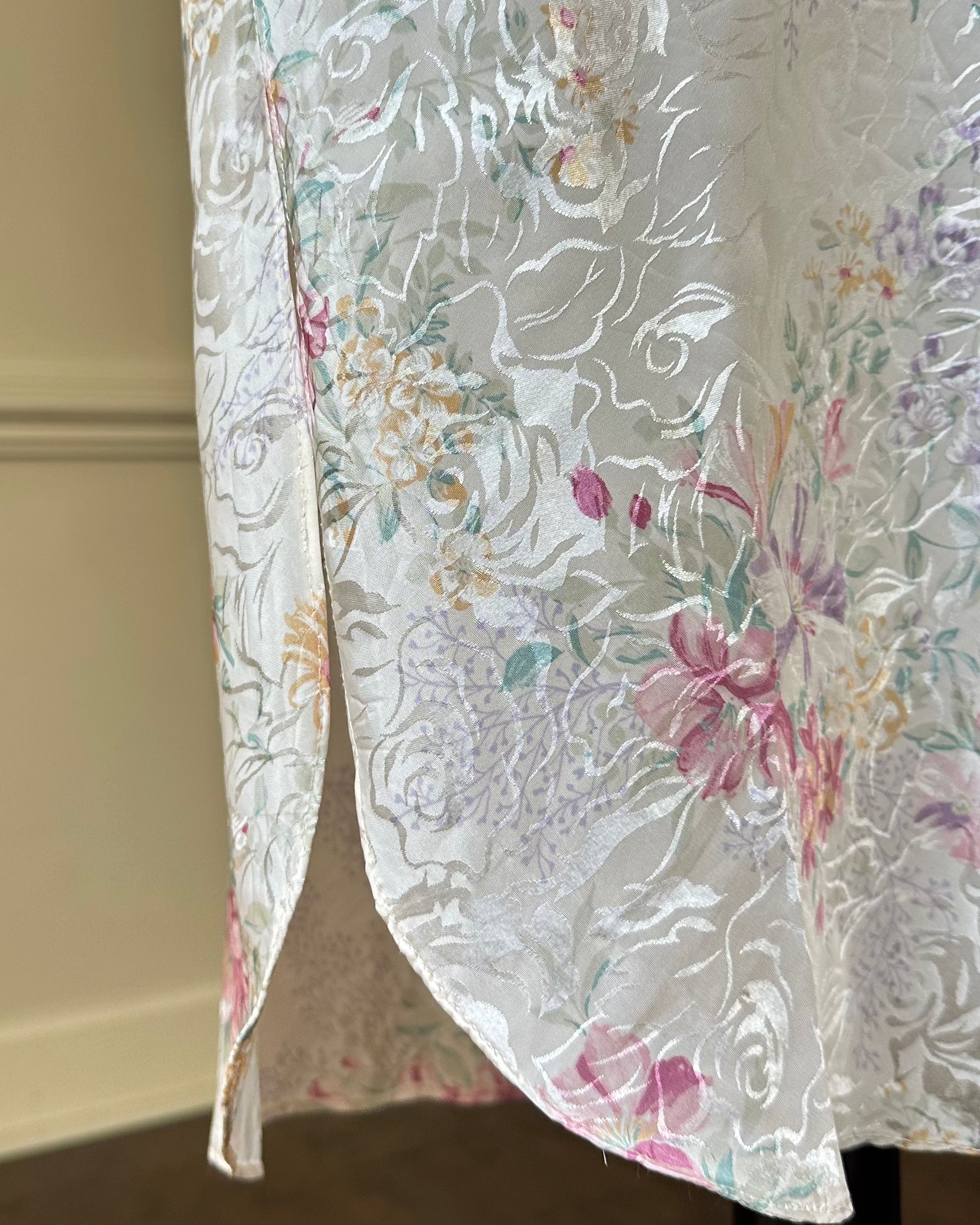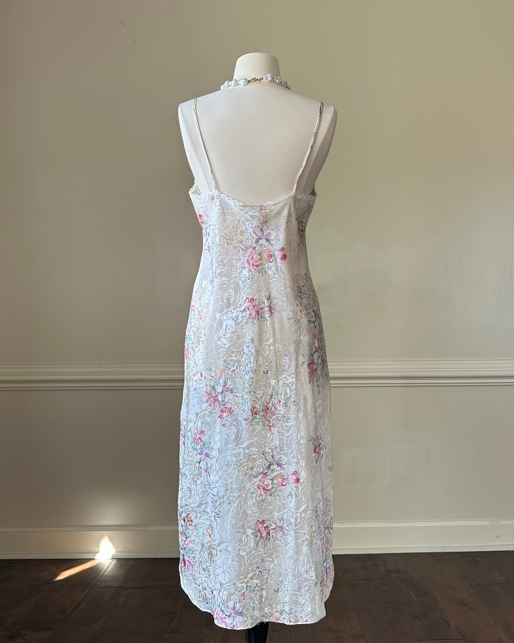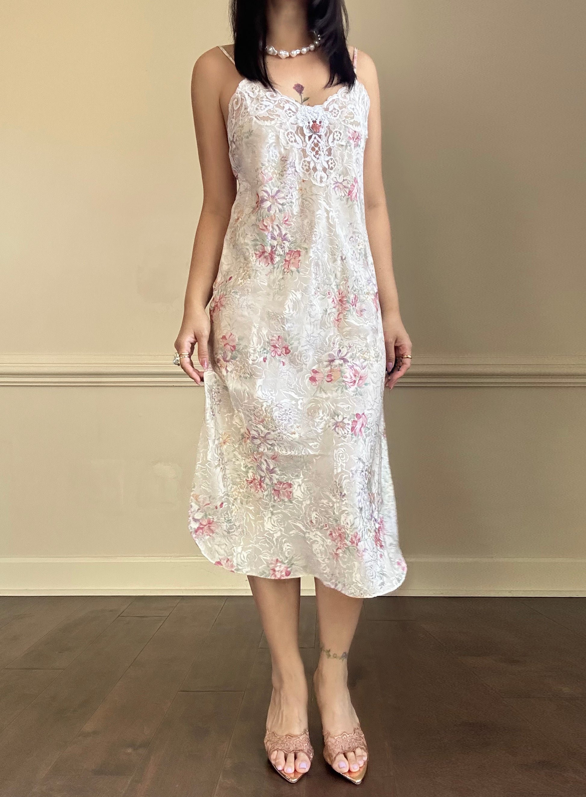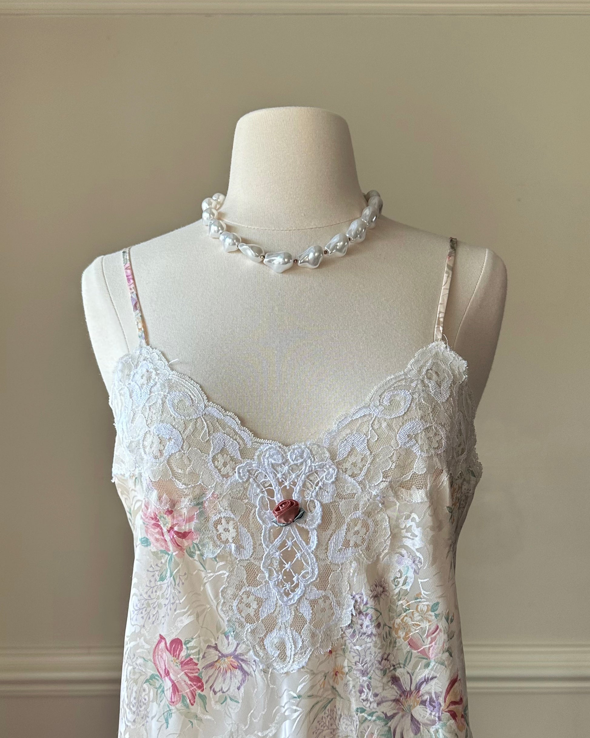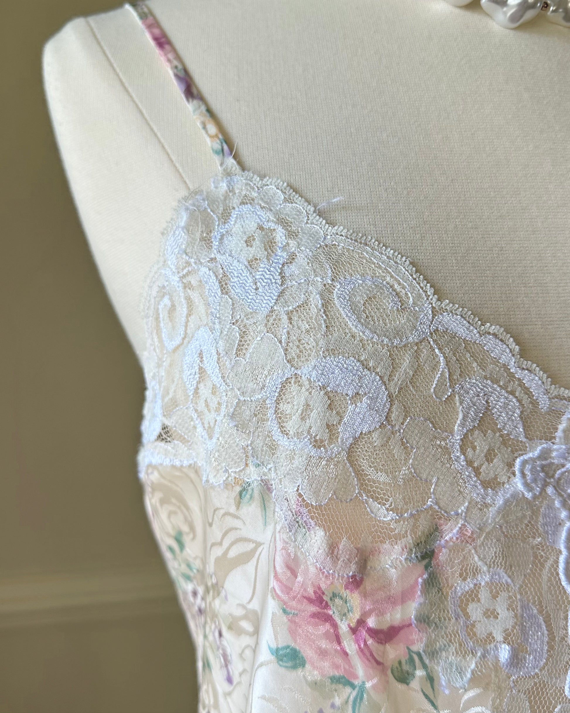 Features delicate white lace trim at the bust and a pink rosebud detail in the center