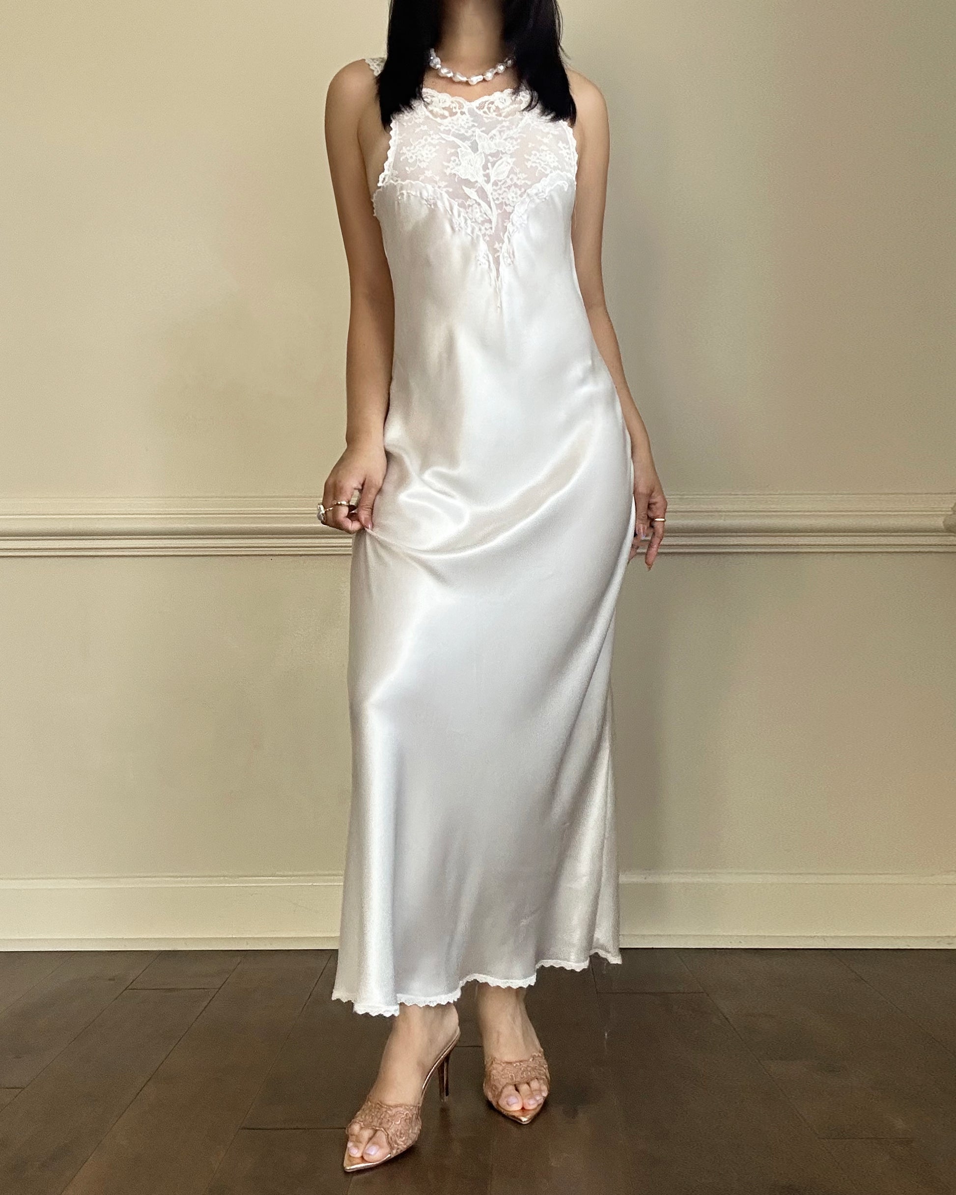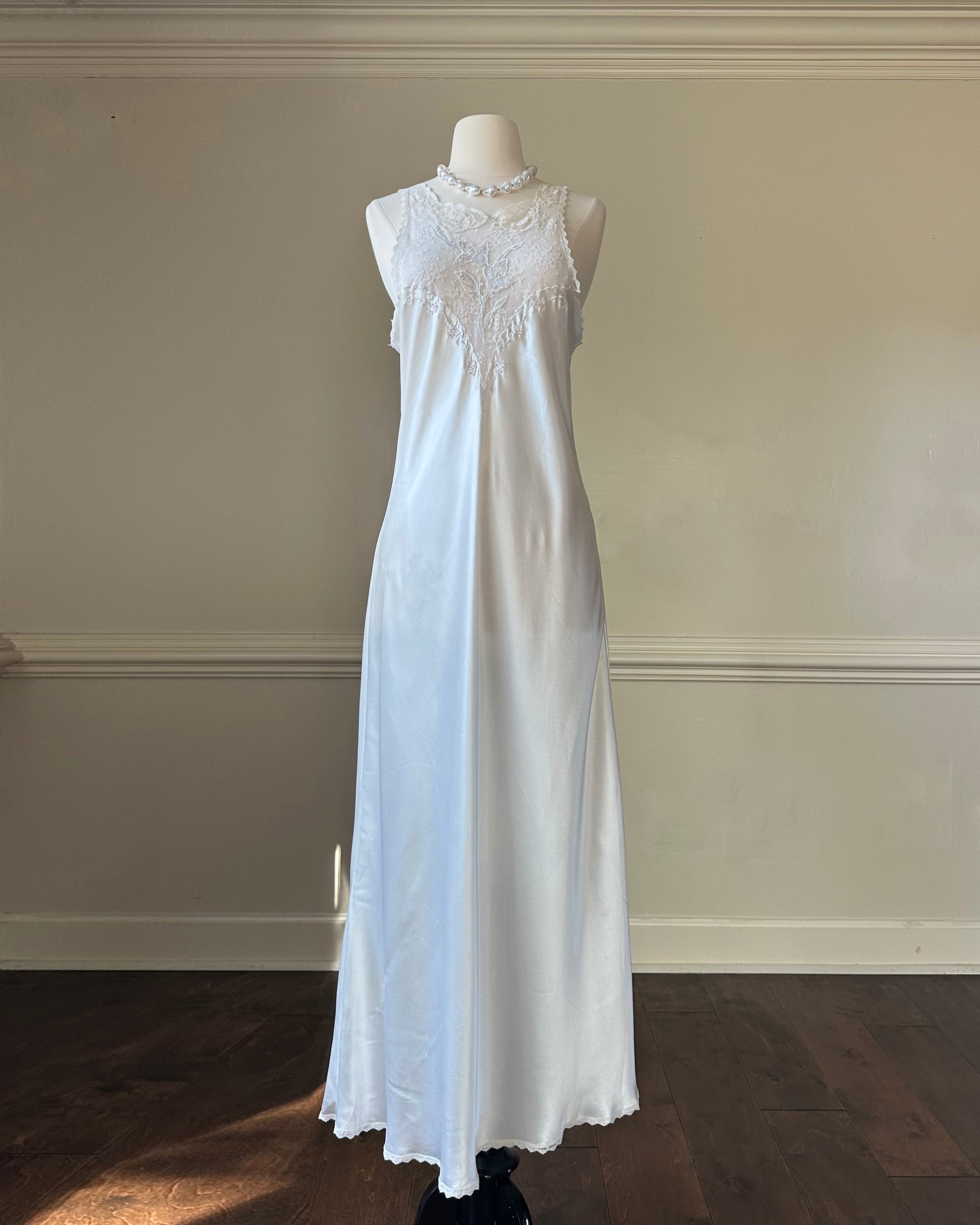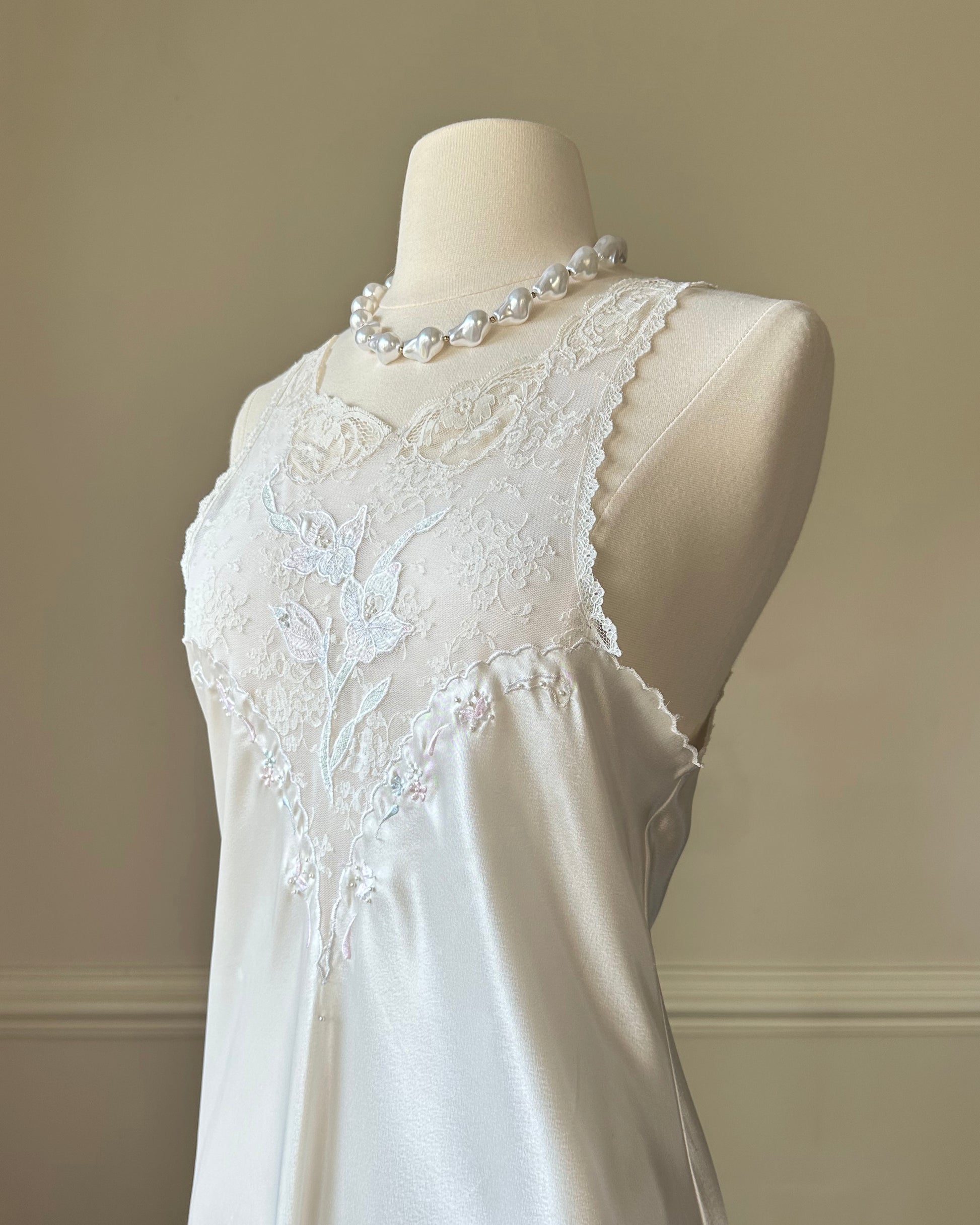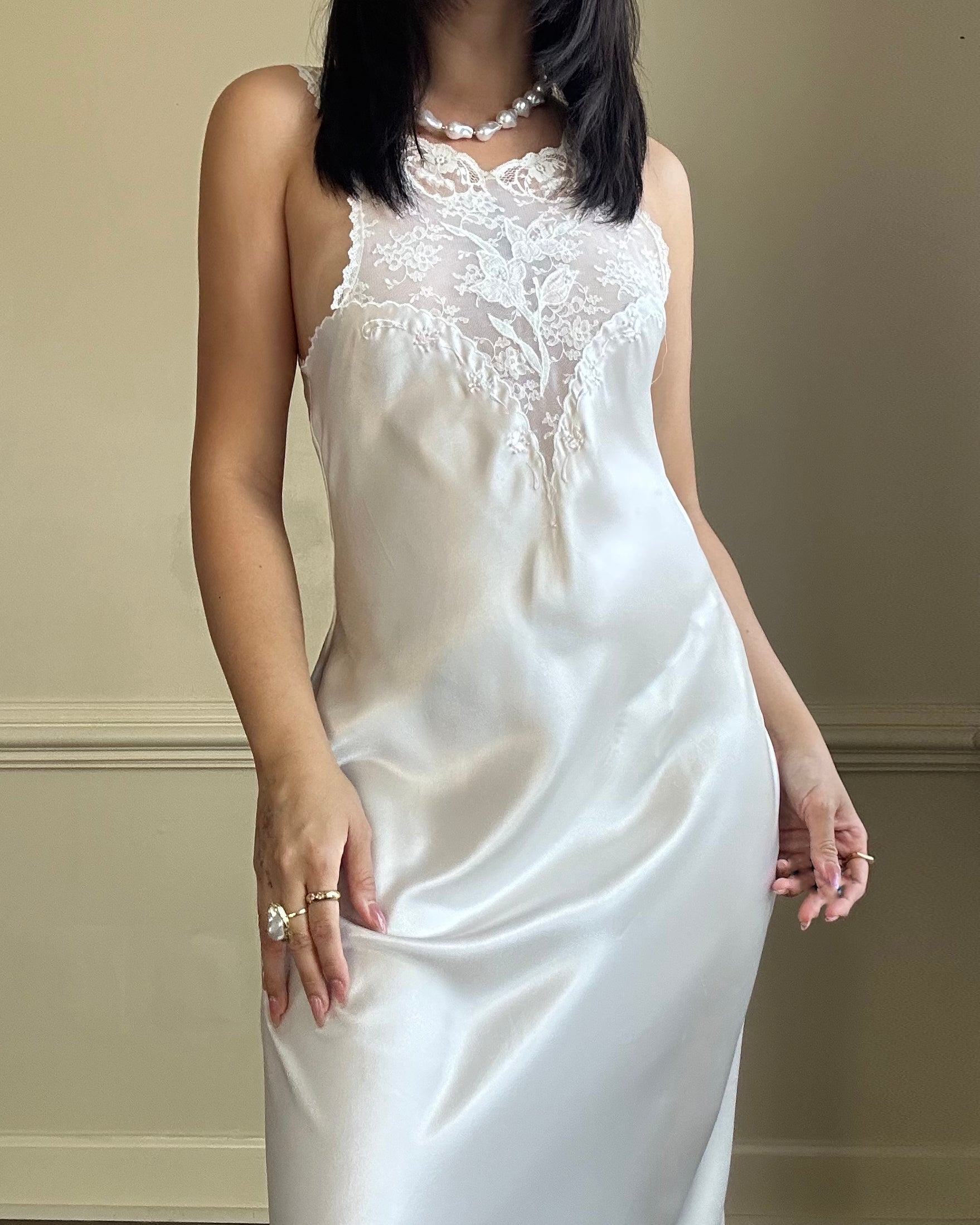 Vintage ivory satin slip dress with high neck and dreamy lace details