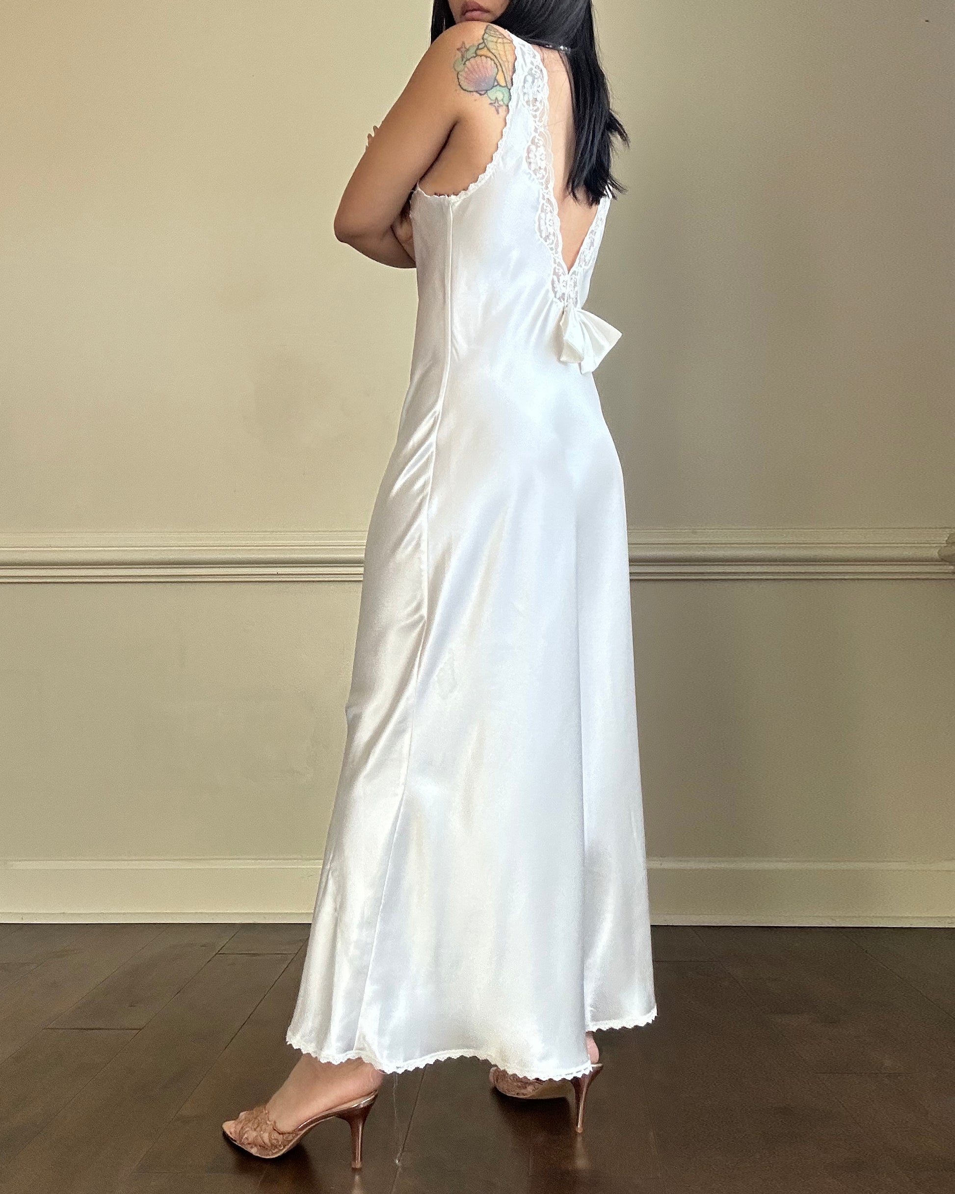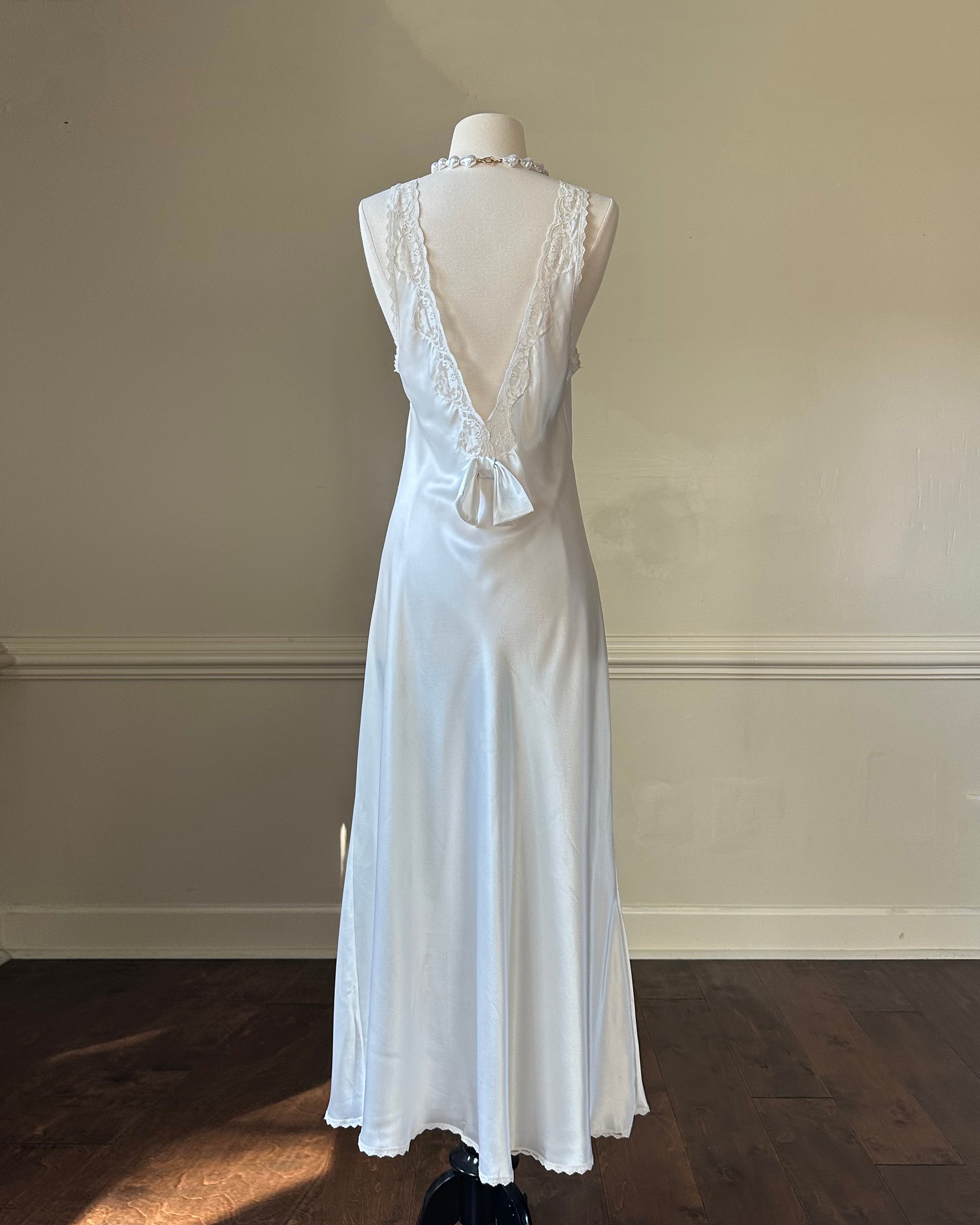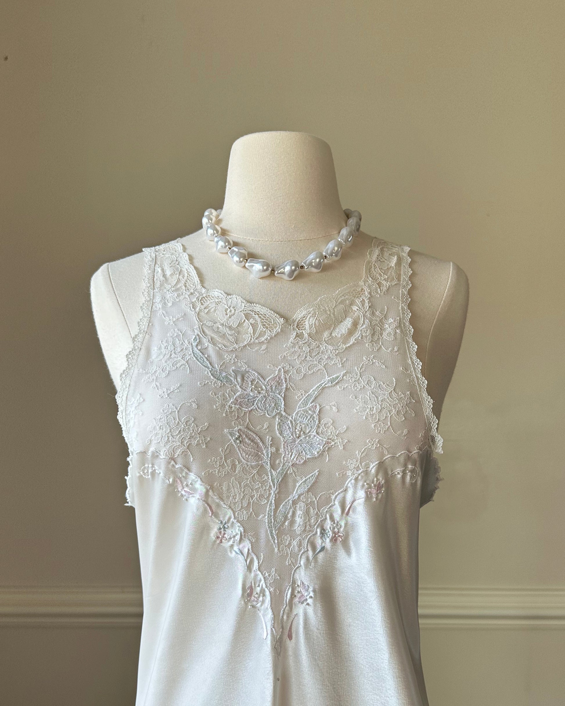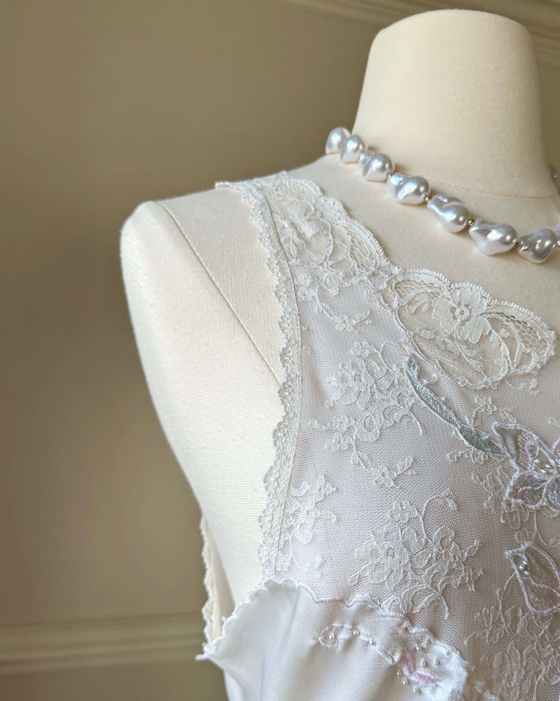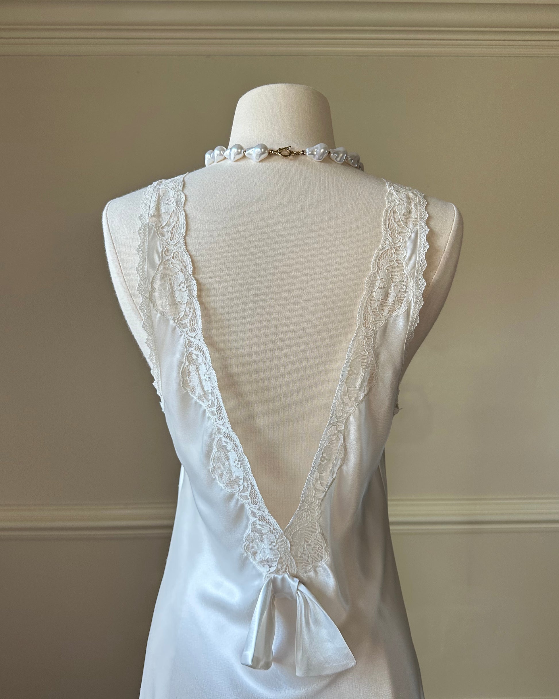 Vintage ivory satin slip dress with high neck and dreamy lace details