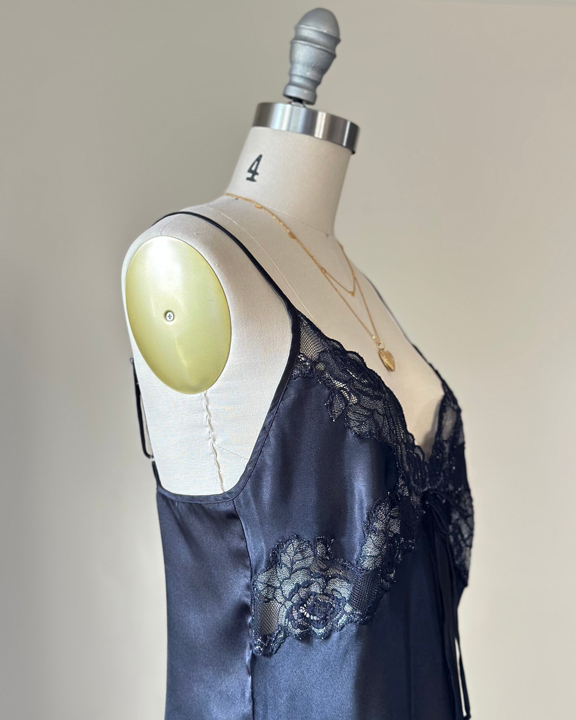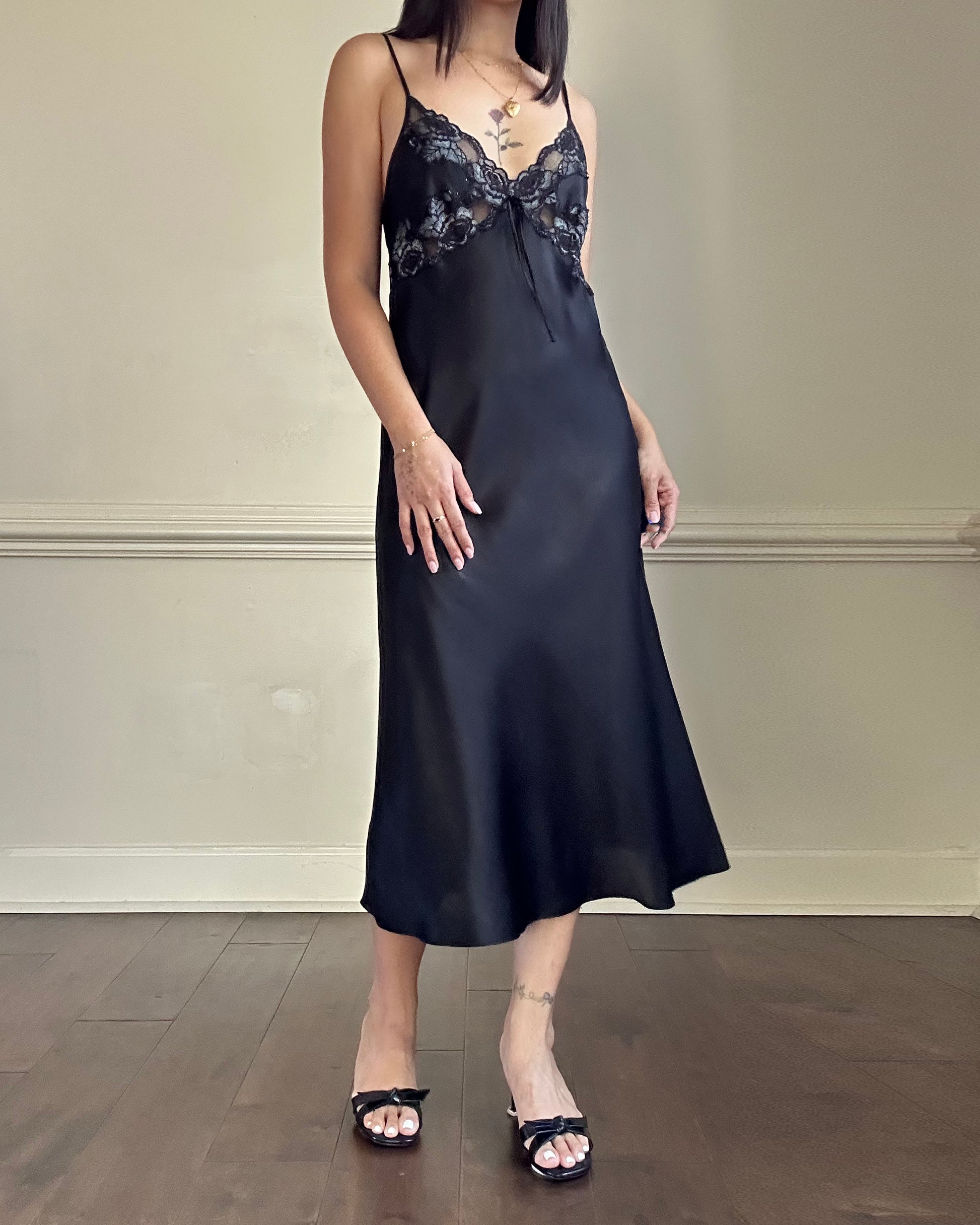 – Elegant 90s black satin-feel slip with sheer floral lace bust and bow detail