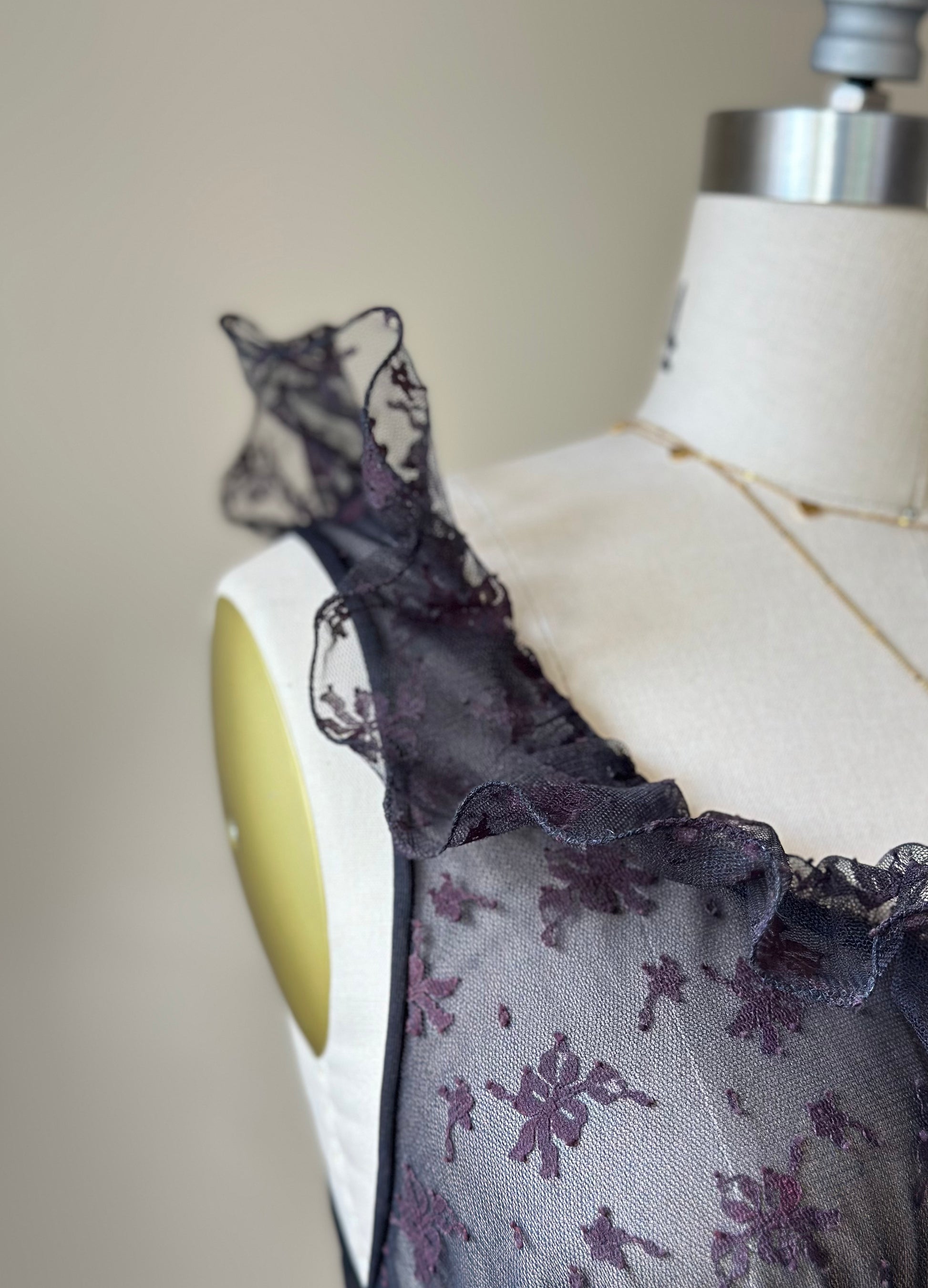 – Delicate sheer overlay with floral lace embroidery in deep plum over black