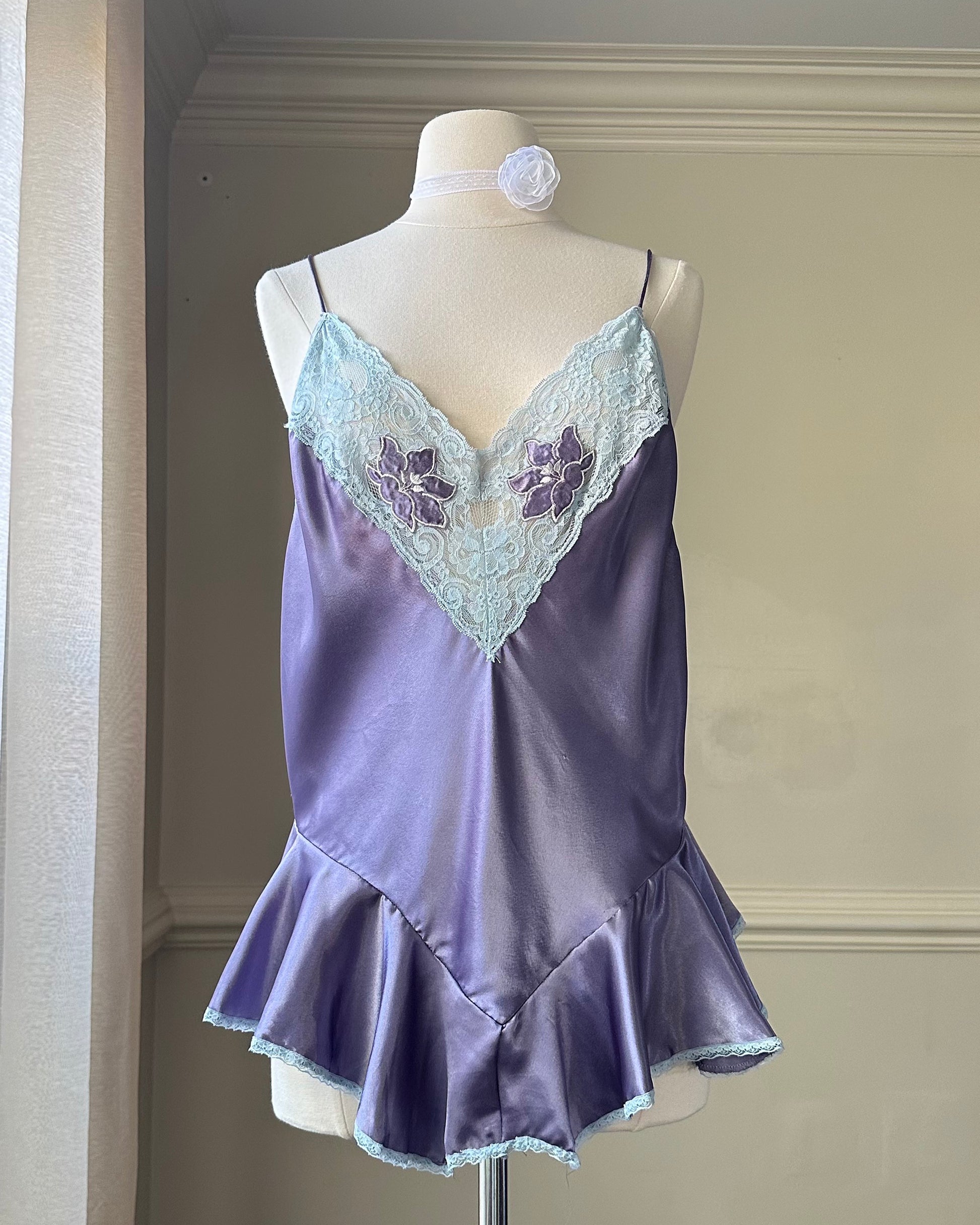 ༄ Vintage satin slip dress in eggplant purple featuring lace V cutout with embroidered flowers