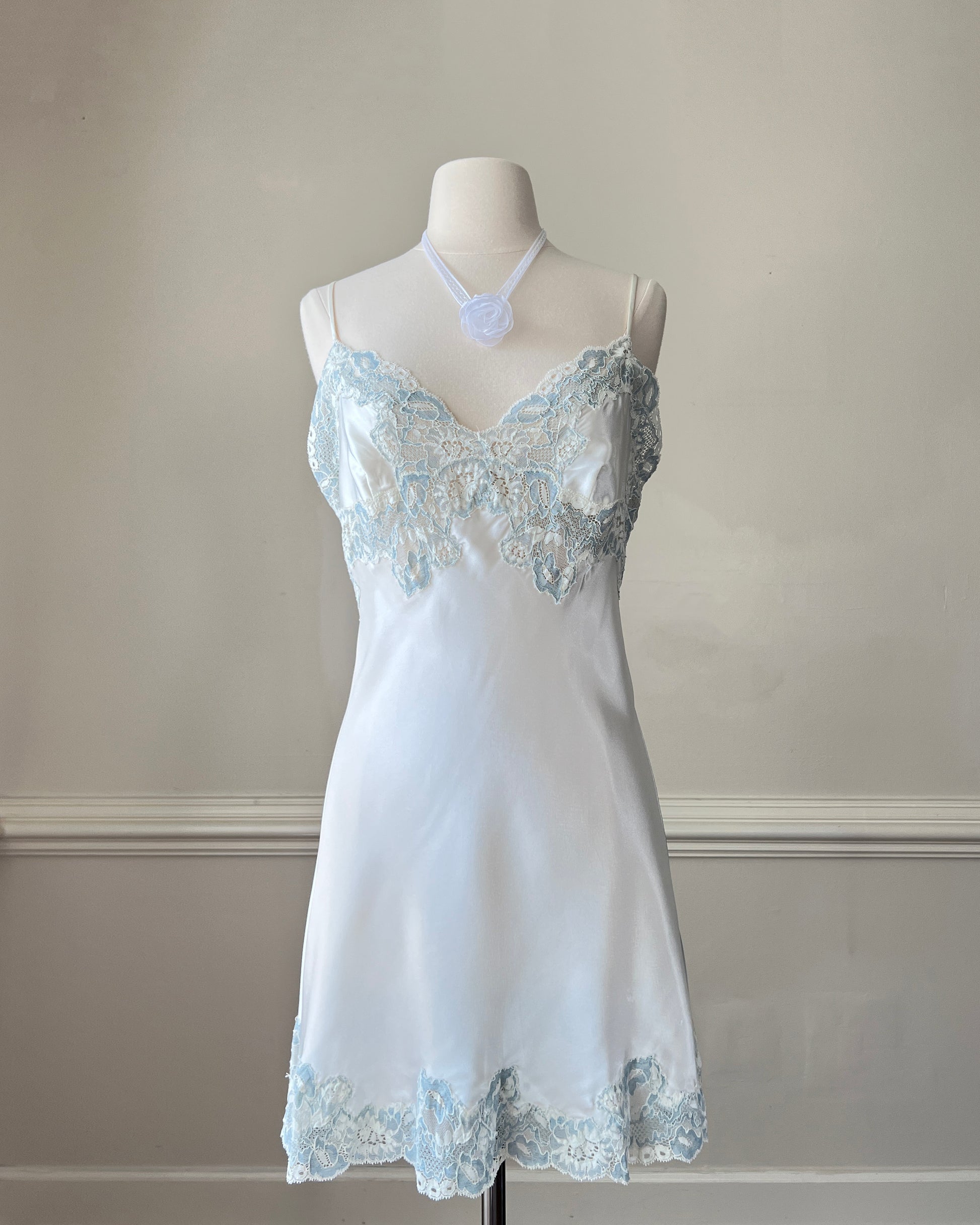 Vintage Victoria’s Secret pearl satin mini slip with blue lace